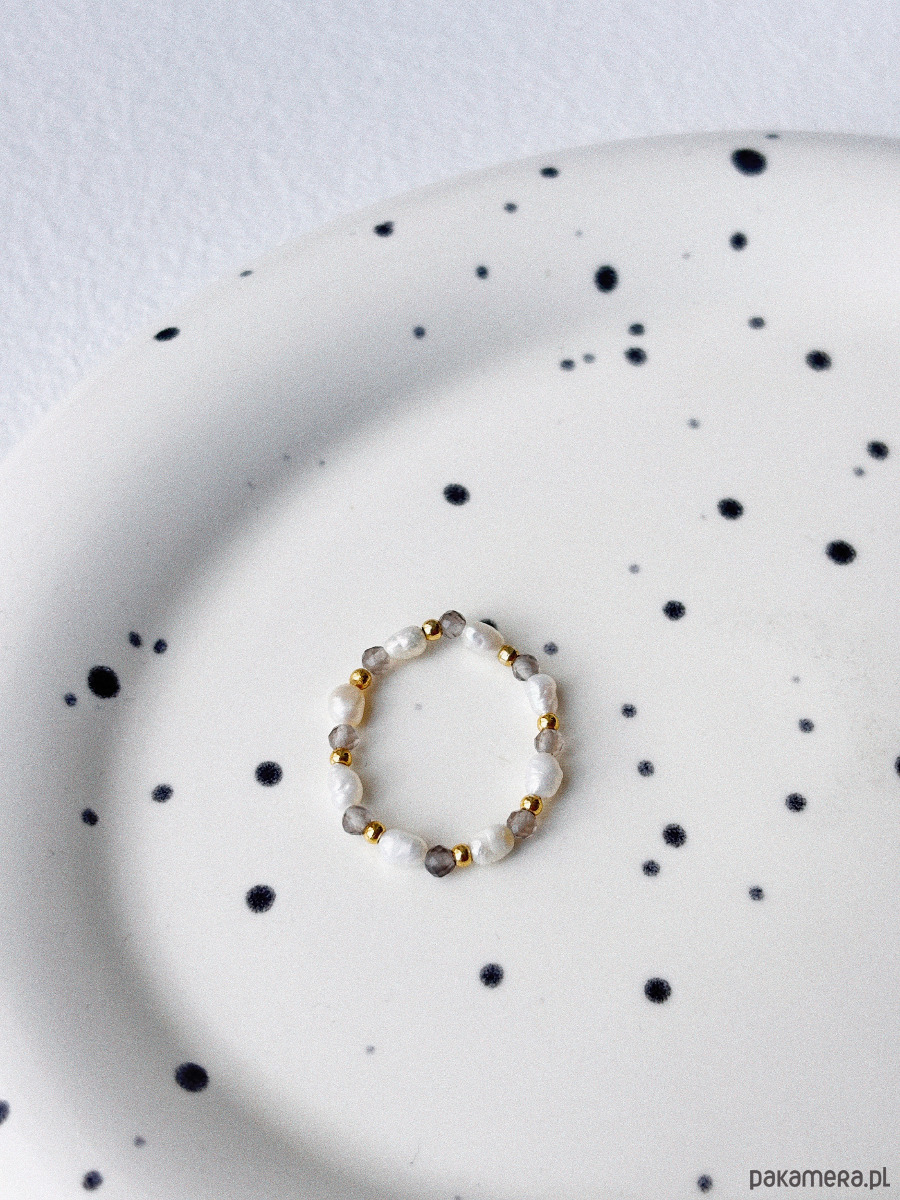 Pierścionek wykonany jest z kwarcu dymnego, pereł naturalnych słodkowodnych oraz pozłacanych przekładek.