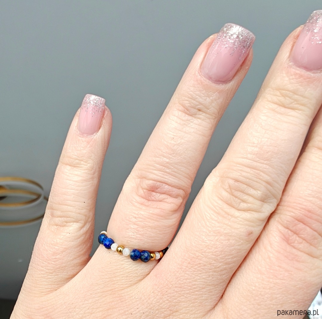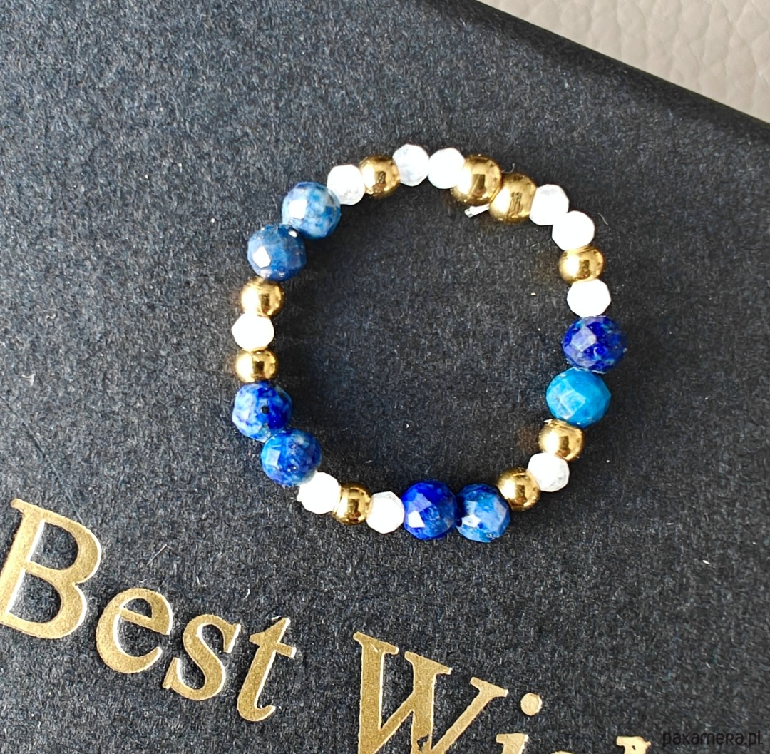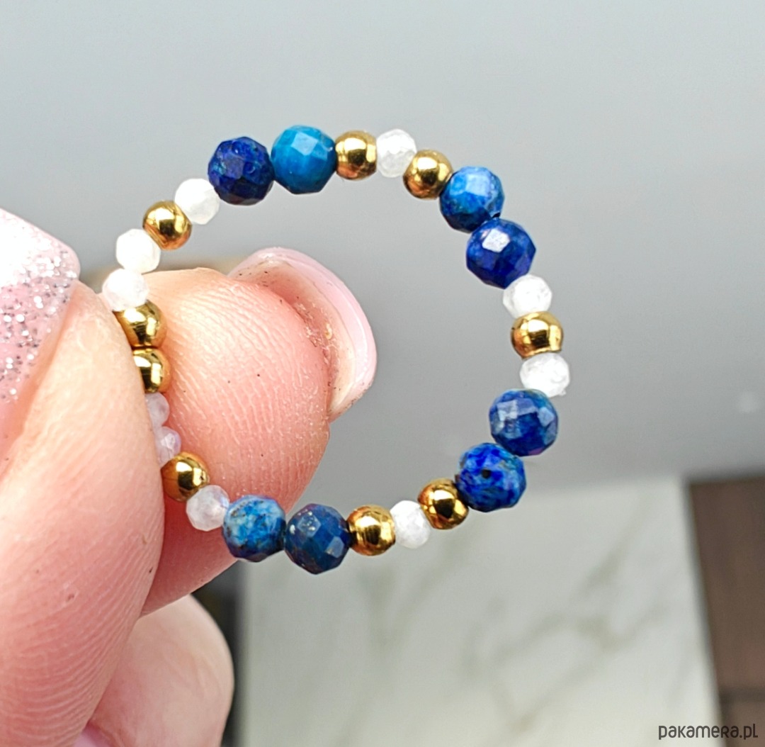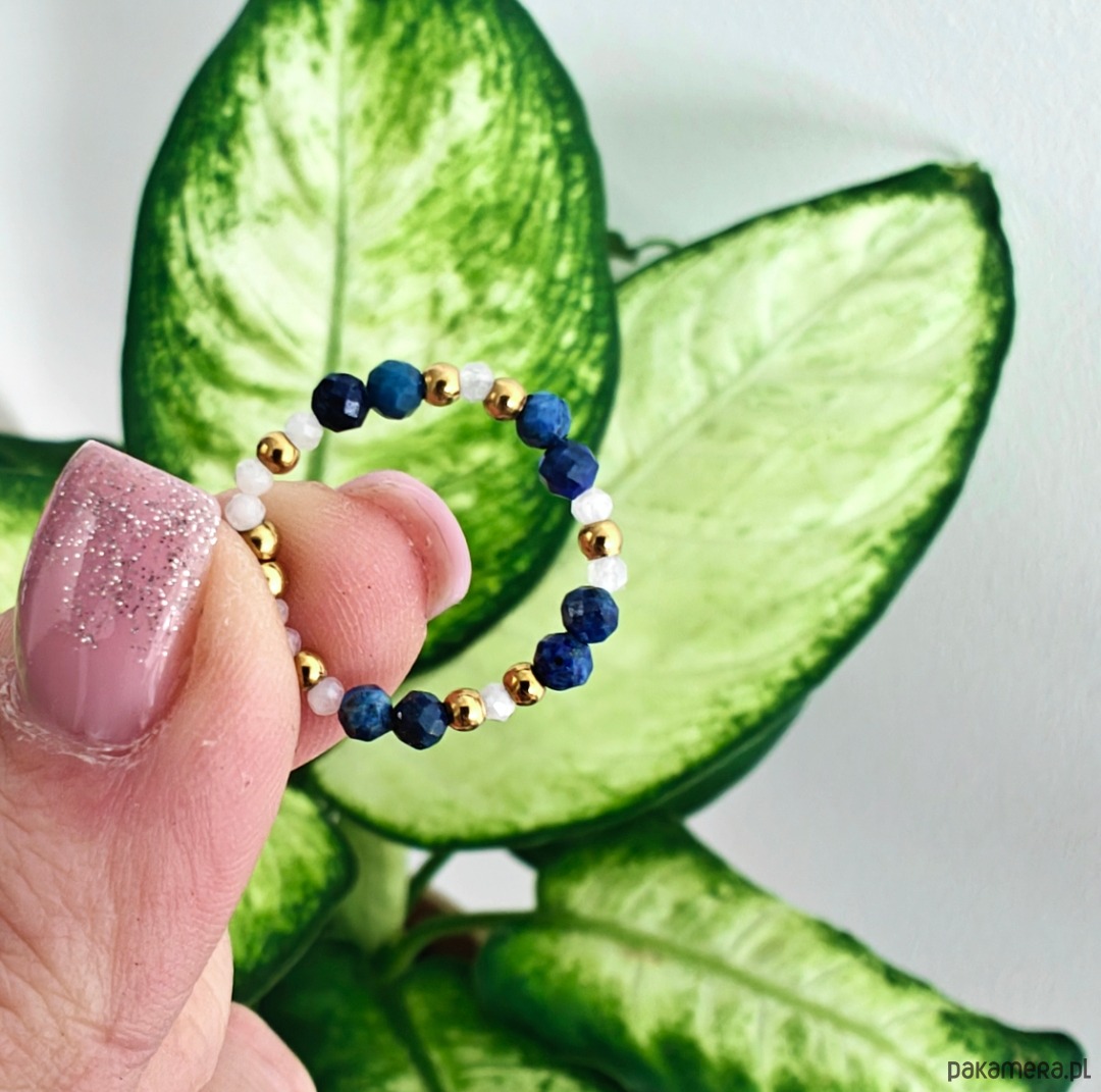 Ten pierścionek to delikatne i harmonijne połączenie lapis lazuli z kamieniem księżycowym. Lapis lazuli o średnicy 3 mm nadaje całości głębi i intensywnego koloru, natomiast kamień księżycowy o średnicy 2 mm wnosi lekkość i subtelny, mleczny blask.