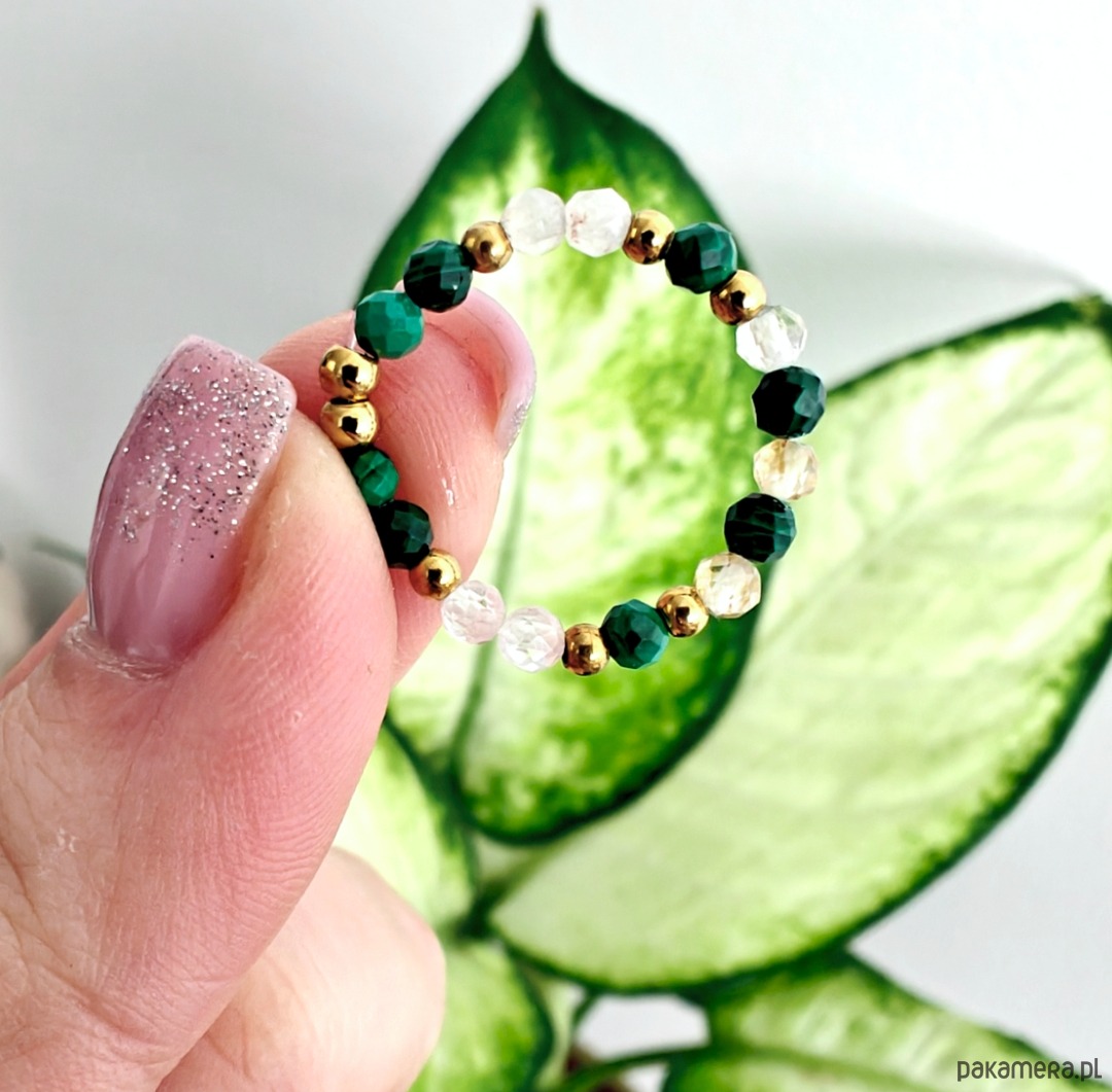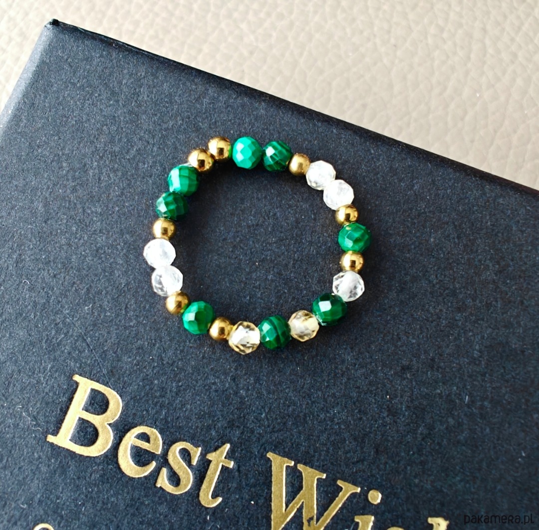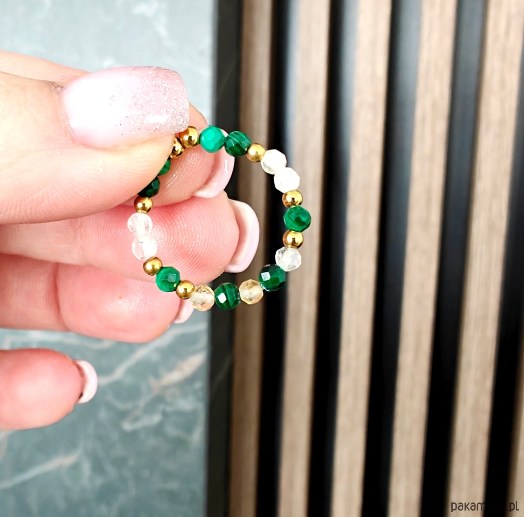 Ten pierścionek to świeże, energetyczne połączenie malachitu i cytrynu. Kamienie o średnicy 3 mm tworzą lekką, ale wyrazistą kompozycję, która pięknie prezentuje się na dłoni i sprawdzi się zarówno noszona samodzielnie, jak i w zestawieniu z innymi pierścionkami.