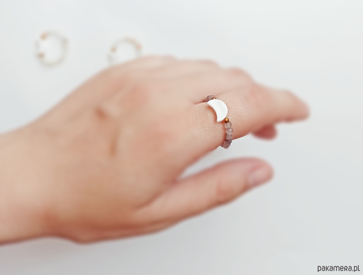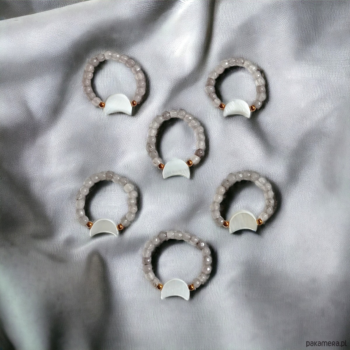 Pierścionek elastyczny: lunula : agat szary, muszla naturalna