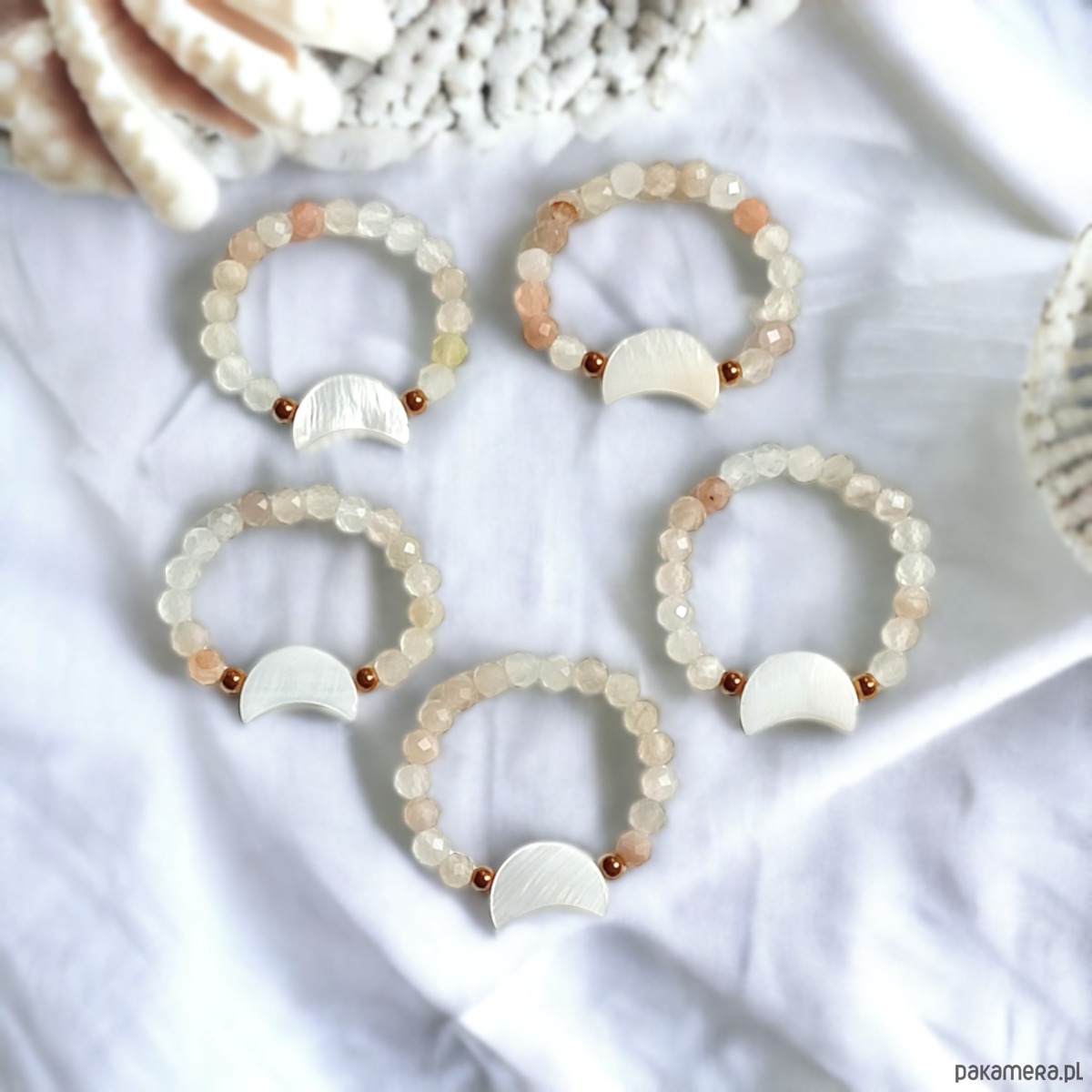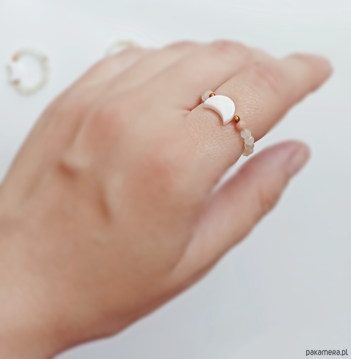 Pierścionek elastyczny: lunula : kamień słoneczny, muszla naturalna