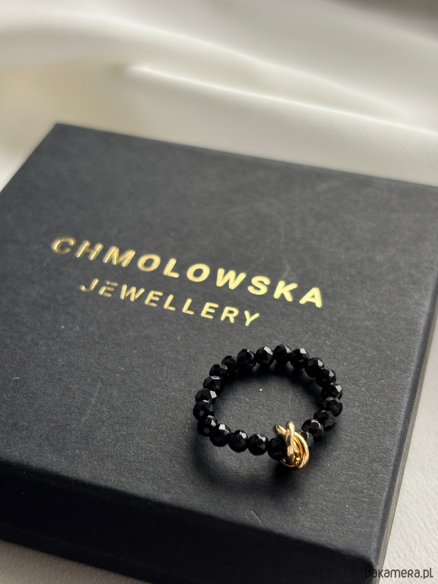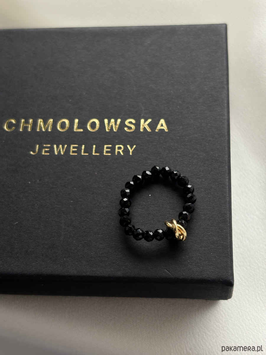 Pierścionek elastyczny wykonany jest na gumce jubilerskiej z użyciem onyksu i pozłacanych przekładek.