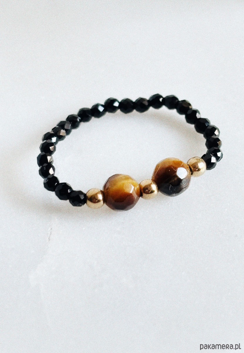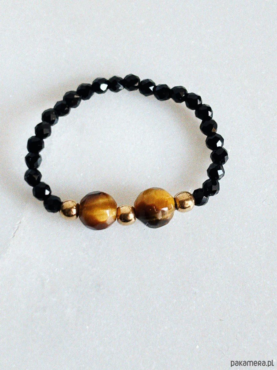 Pierścionek elastyczny wykonany jest na gumce jubilerskiej z kamienia Onyks oraz Tygrysie oko, oraz pozłacanych przekładek.