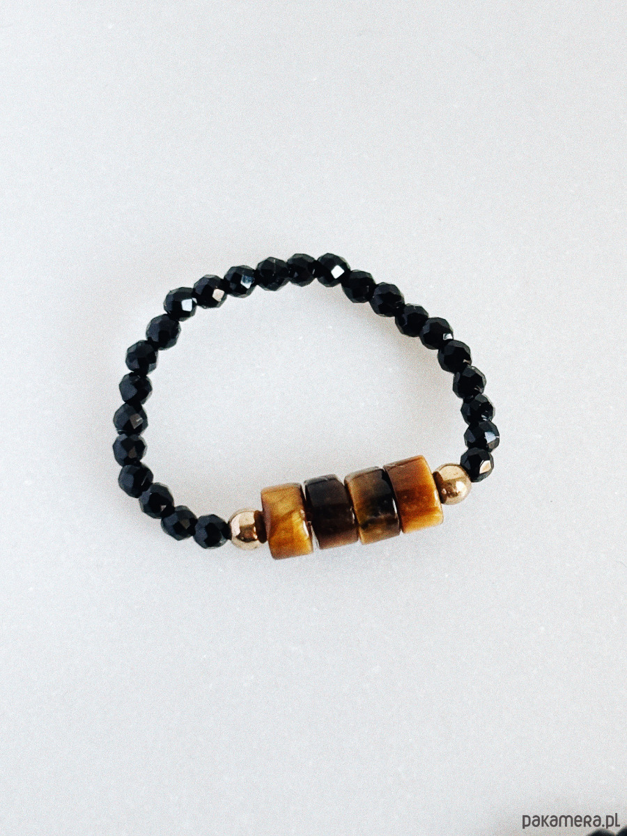 Pierścionek elastyczny wykonany jest na gumce jubilerskiej z kamienia Onyks i Tyrgysie Oko, oraz pozłacanych przekładek.