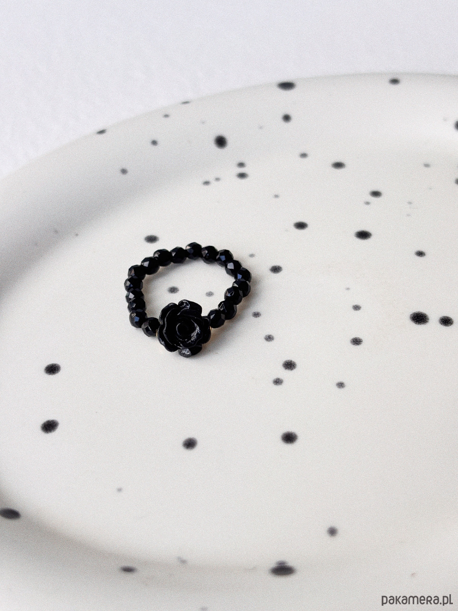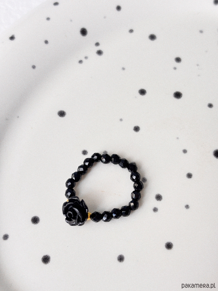 Pierścionek wykonany jest na gumce elastycznej z użyciem onyksu i róży.