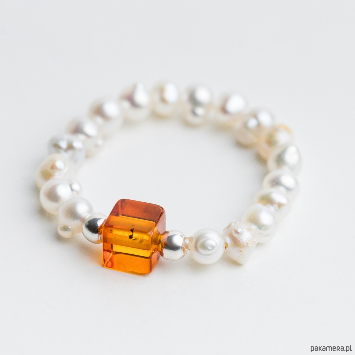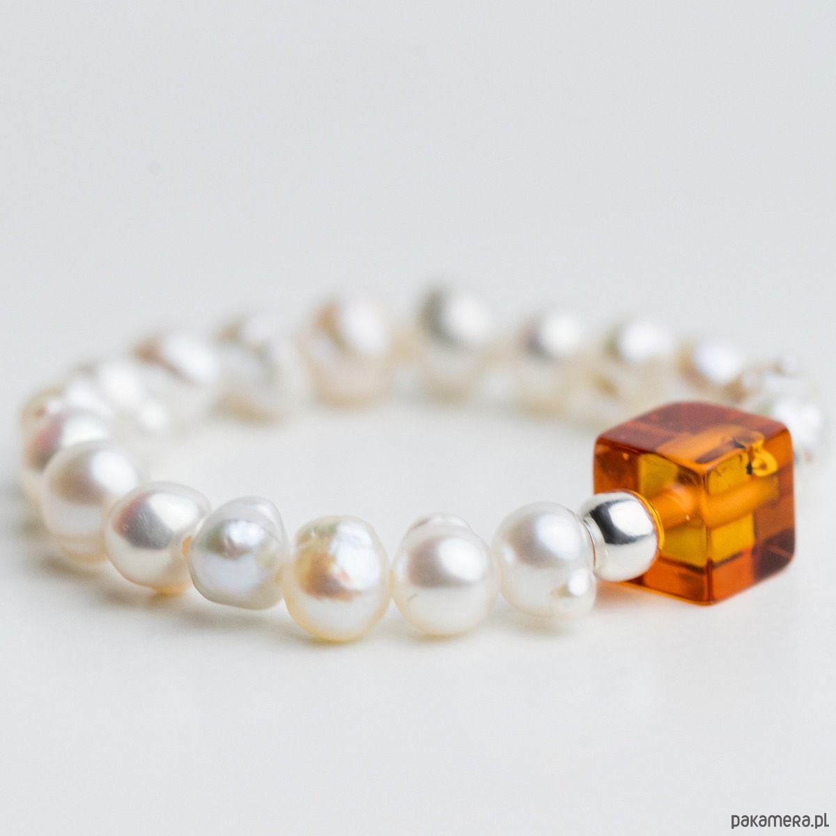 Subtelny i niezwykle elegancki pierścionek wykonany z połączenia mlecznego bursztynu bałtyckiego oraz naturalnych pereł słodkowodnych. W centrum znajduje się unikalny sześcian w klasycznym, koniakowym kolorze. Jego ciepły kolor pięknie kontrastuje z klasycznym blaskiem perłowych koralików, tworząc biżuterię o wyjątkowo szlachetnym charakterze.