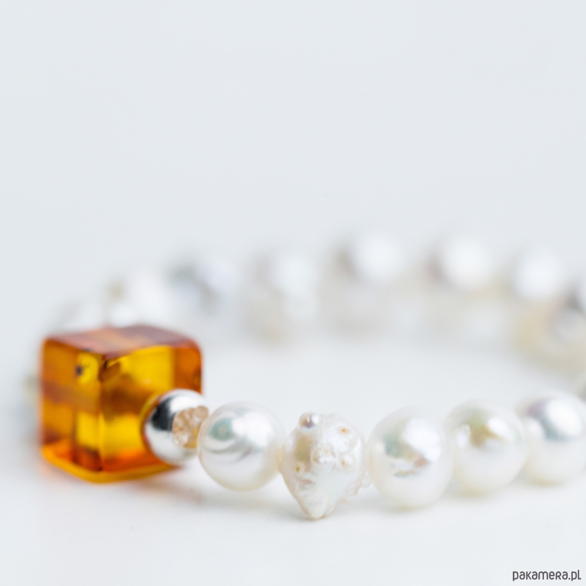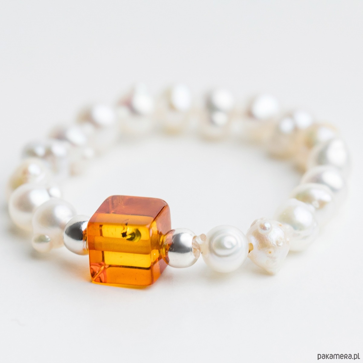Materiały: bursztyn bałtycki, srebro próba 925, naturalne perły hodowlane, elastyczna gumka