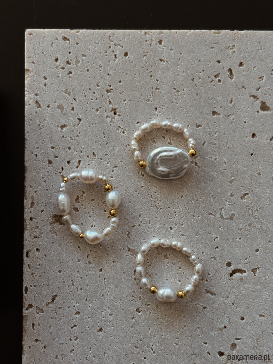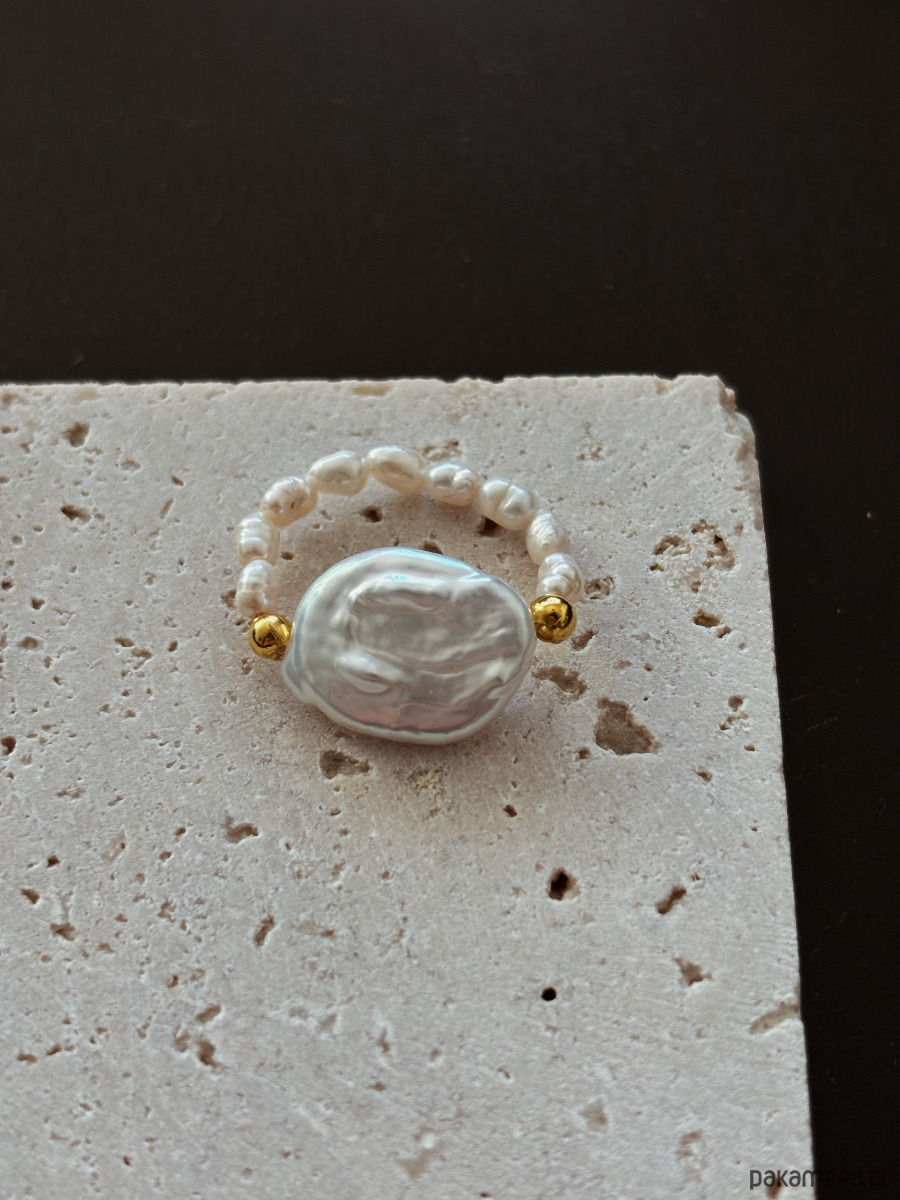 Pierścionek wykonany jest na gumce elastycznej z pereł naturalnych- mniejszych i większej płaskiej.