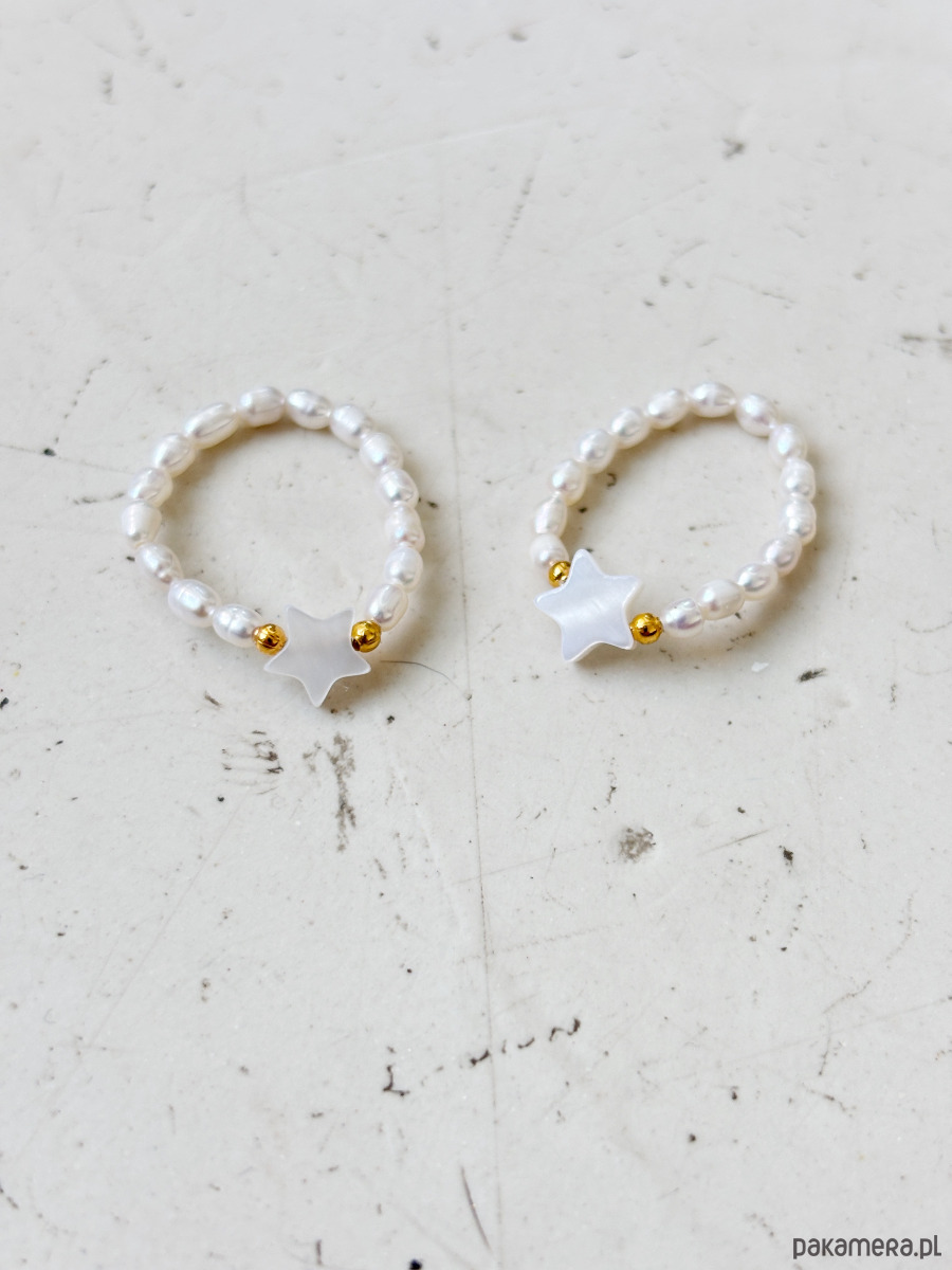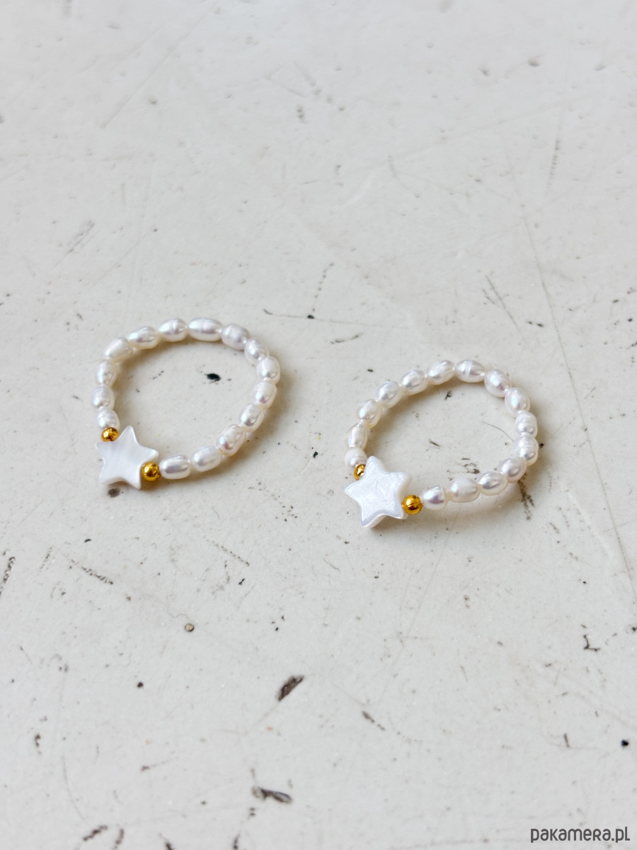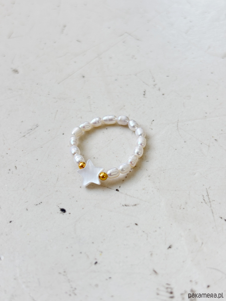 Pierścionek elastyczny wykonany jest na gumce jubilerskiej z pereł naturalnych i gwiazdki z masy perłowej.