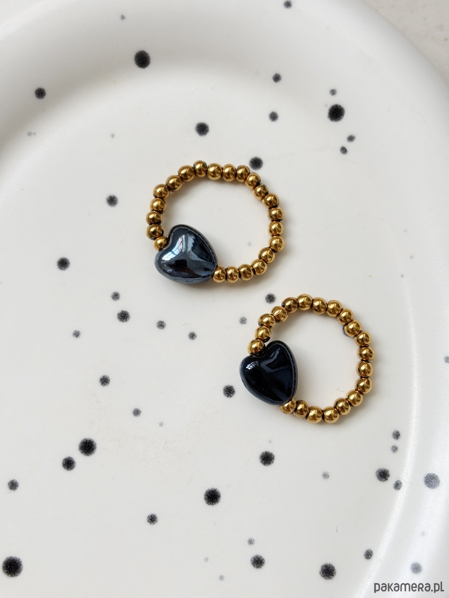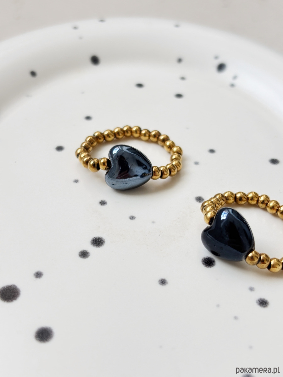 Pierścionek elastyczny wykonany jest na gumce jubilerskiej z hematytu i serca ceramicznego.