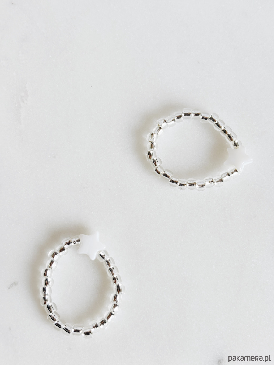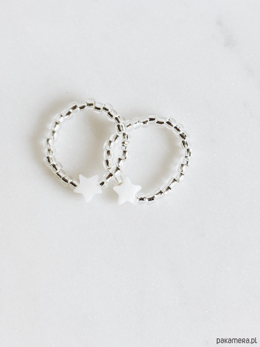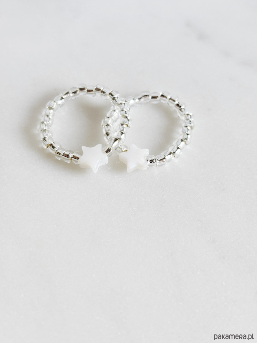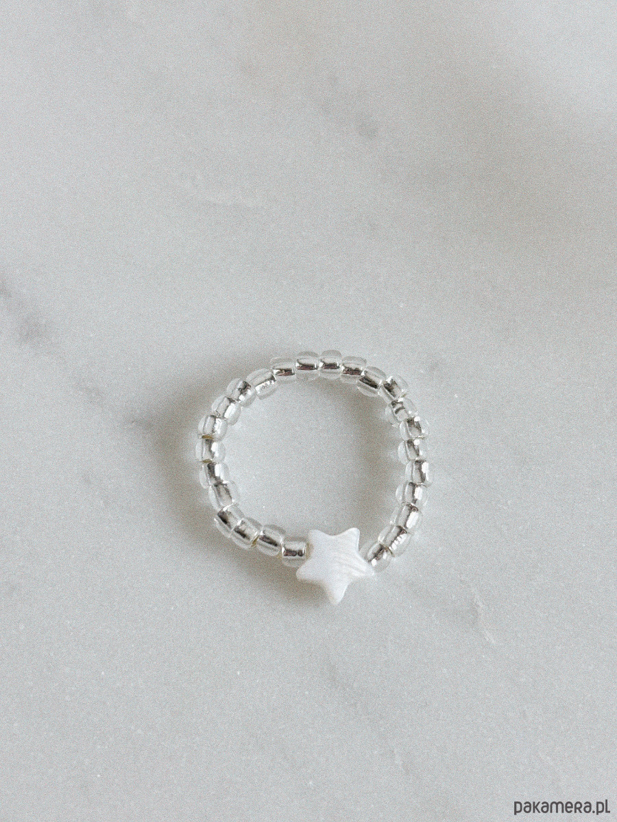 Pierścionek elastyczny wykonany jest na gumce jubilerskiej z koralików toho i gwiazdki z masy perłowej.