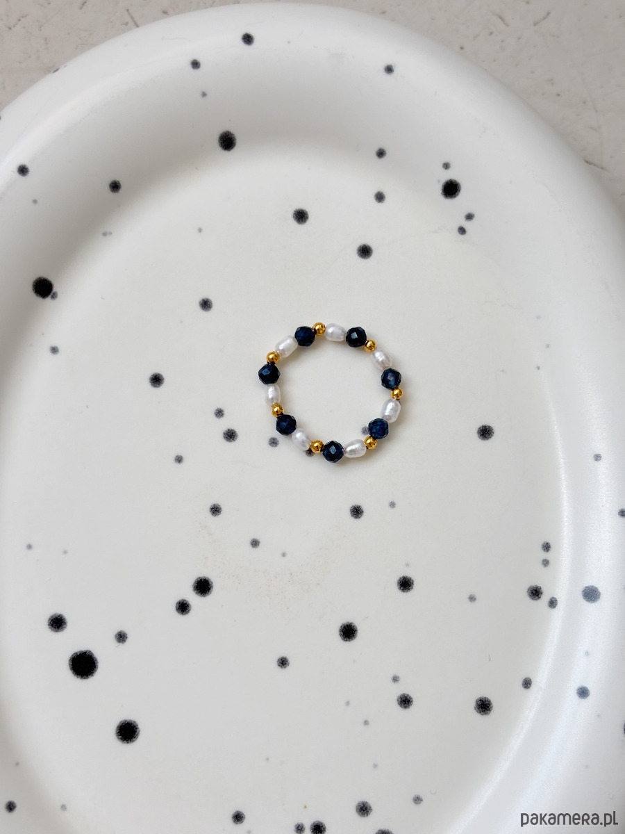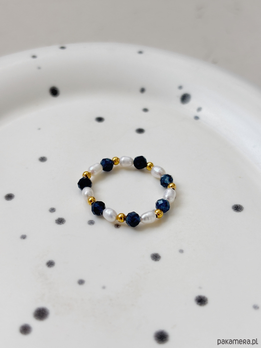 Pierścionek elastyczny wykonany jest na gumce jubilerskiej z użyciem szafiru, perły i pozłacanych przekładek.