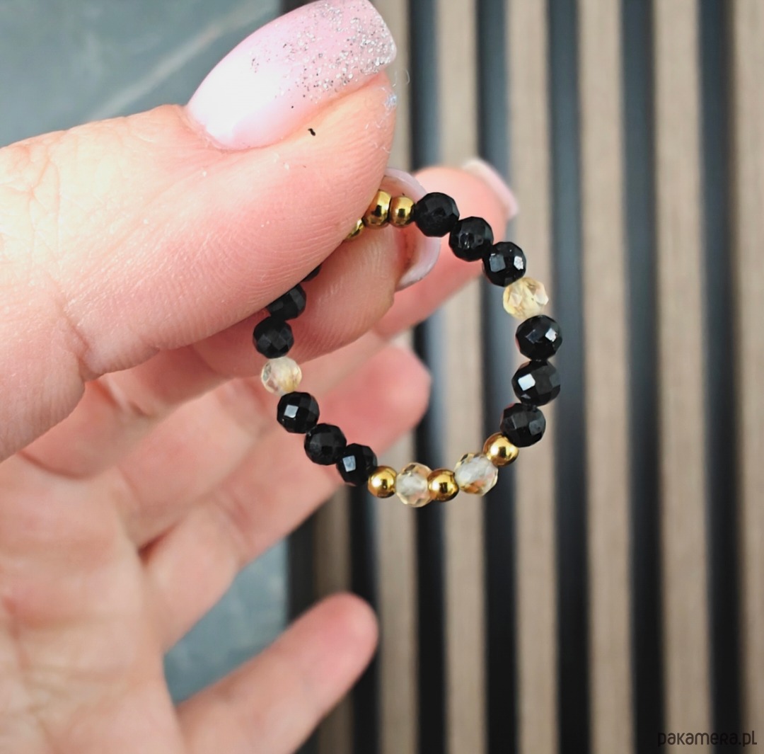 Ten pierścionek to eleganckie połączenie głębokiej czerni czarnego turmalinu z ciepłym blaskiem cytrynu. Drobne kamienie o średnicy 2 mm tworzą lekką, subtelną formę, która pięknie prezentuje się na dłoni i sprawdzi się zarówno noszona samodzielnie, jak i w zestawieniu z innymi pierścionkami.