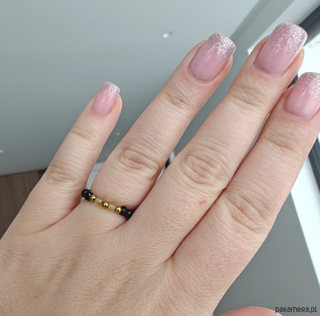 Pierścionek został wykonany na elastycznej gumce, dzięki czemu wygodnie dopasowuje się do palca i zapewnia komfort noszenia na co dzień. Całość uzupełniają przekładki ze stali chirurgicznej, które nadają biżuterii nowoczesnego i trwałego charakteru.