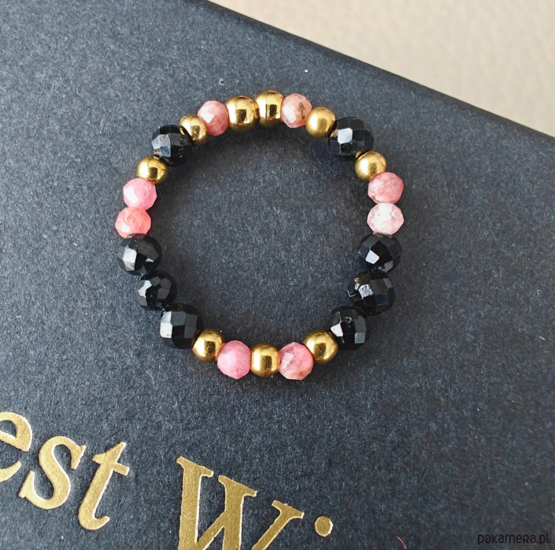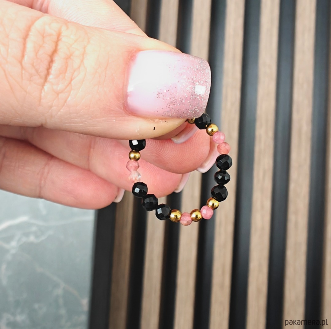 Ten pierścionek to harmonijne połączenie głębokiego koloru turmalinu z delikatnym, różowym odcieniem rodonitu. Drobne kamienie o średnicy 2 mm tworzą subtelną i lekką formę, która pięknie prezentuje się na dłoni i sprawdzi się zarówno noszona samodzielnie, jak i w zestawieniu z innymi pierścionkami.
