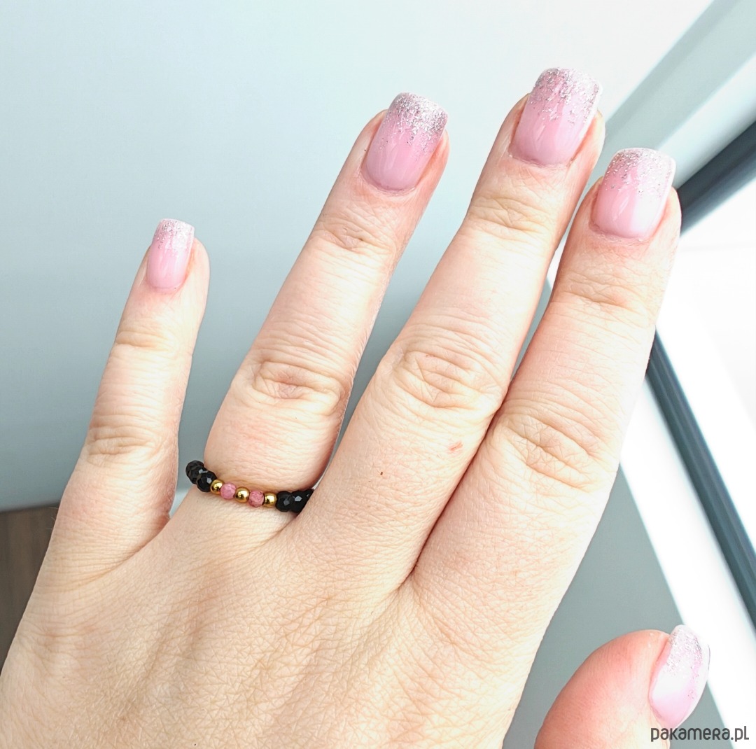 Pierścionek został wykonany na elastycznej gumce, dzięki czemu wygodnie dopasowuje się do palca i zapewnia komfort noszenia na co dzień. Całość uzupełniają przekładki ze stali chirurgicznej, które nadają biżuterii nowoczesnego i trwałego charakteru.