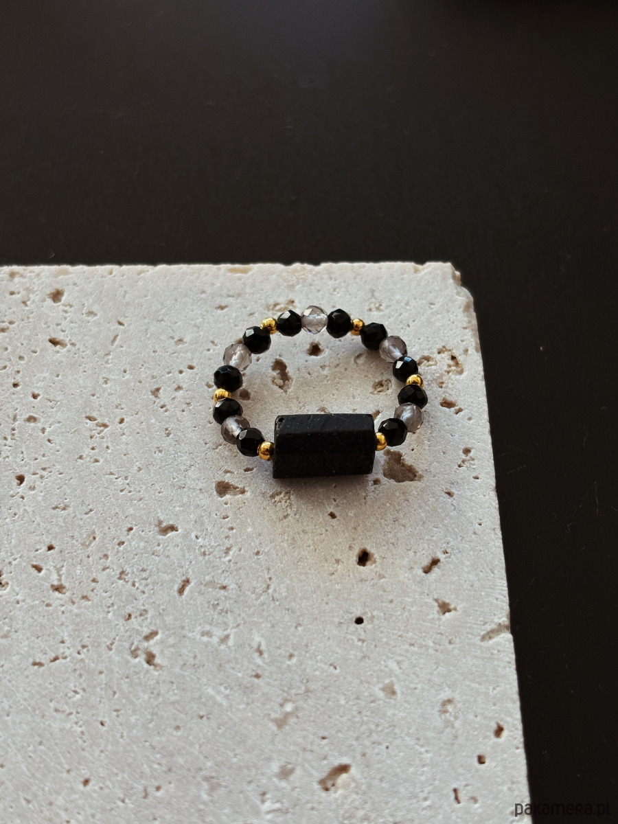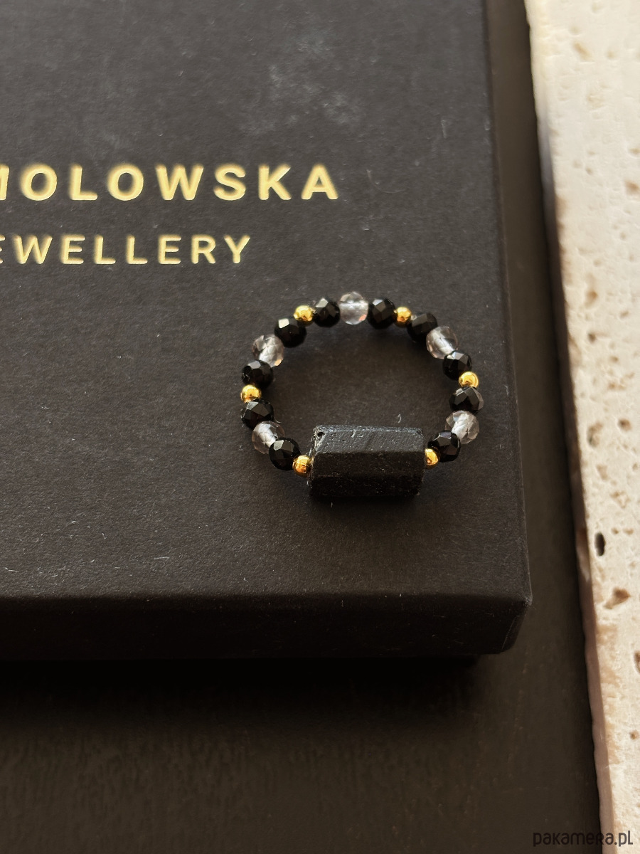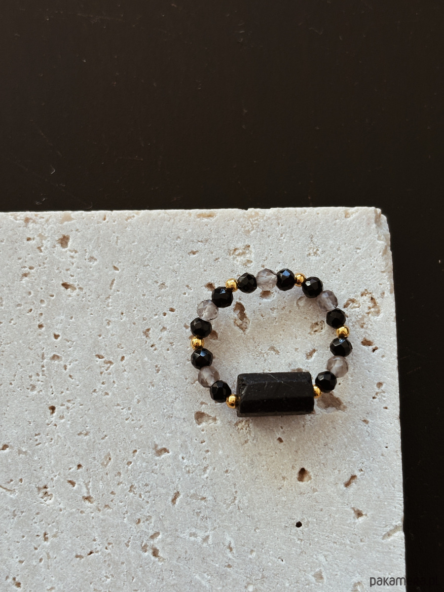 Pierścionek wykonany jest na gumce jubilerskiej z użyciem czarnego onyksu,kwarcu dymnego i bryły turmalinu.