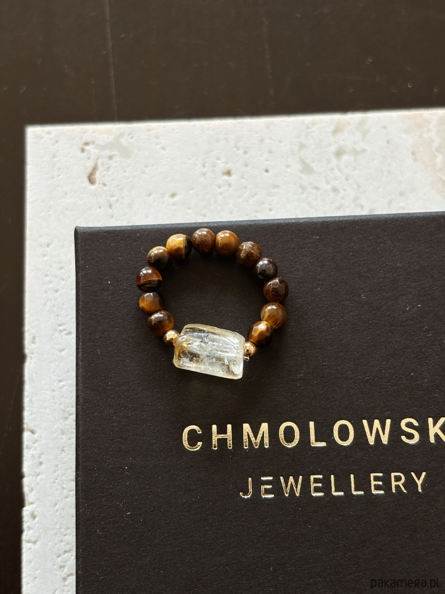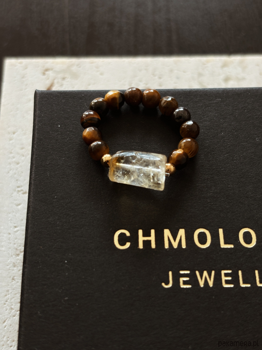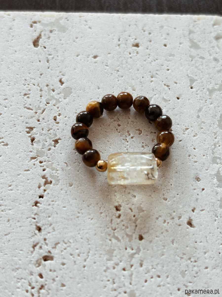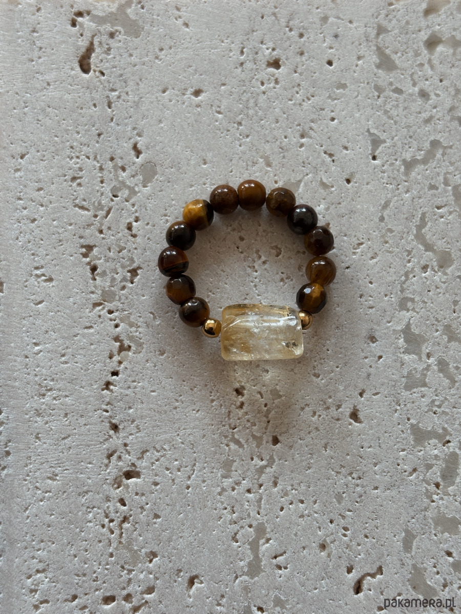 Pierścionek wykonany jest na gumce jubilerskiej z kamieni Tygrysiego Oka i Cytryny w formie bryły.
