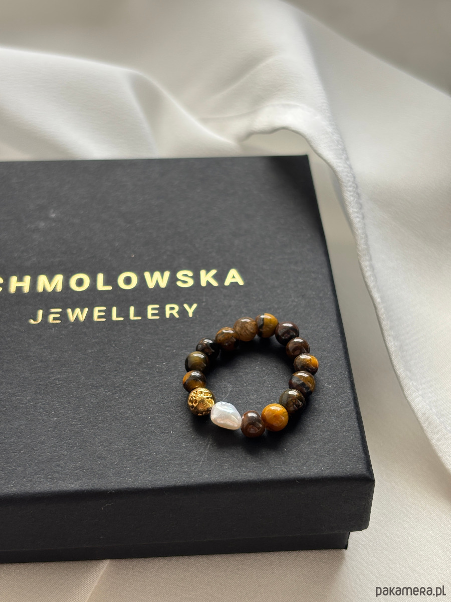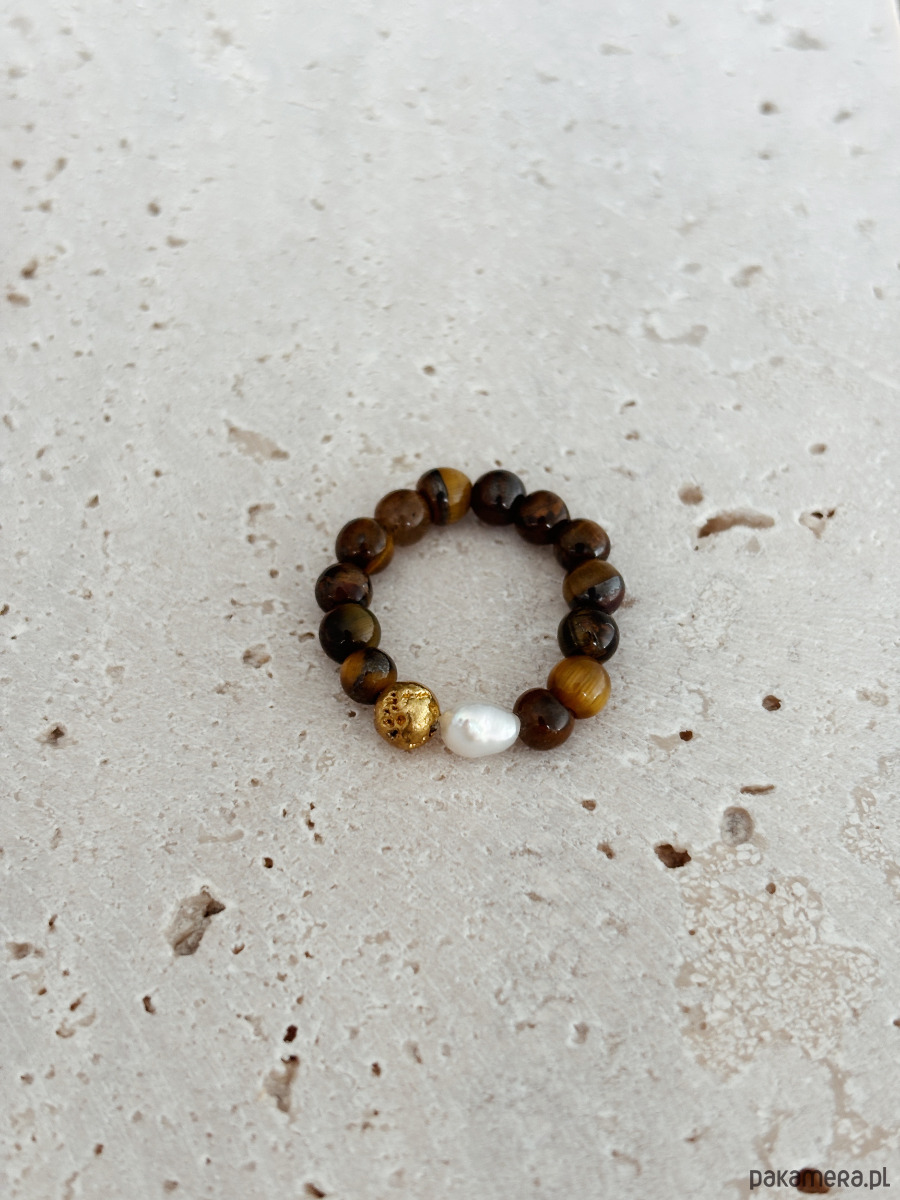 Pierścionek wykonany jest z naturalnych kamieni tygrysiego oka oraz perły naturalnej. Wykonany na elastycznej gumce, dzięki czemu dopasowuje się do palca i jest wygodny w noszeniu.