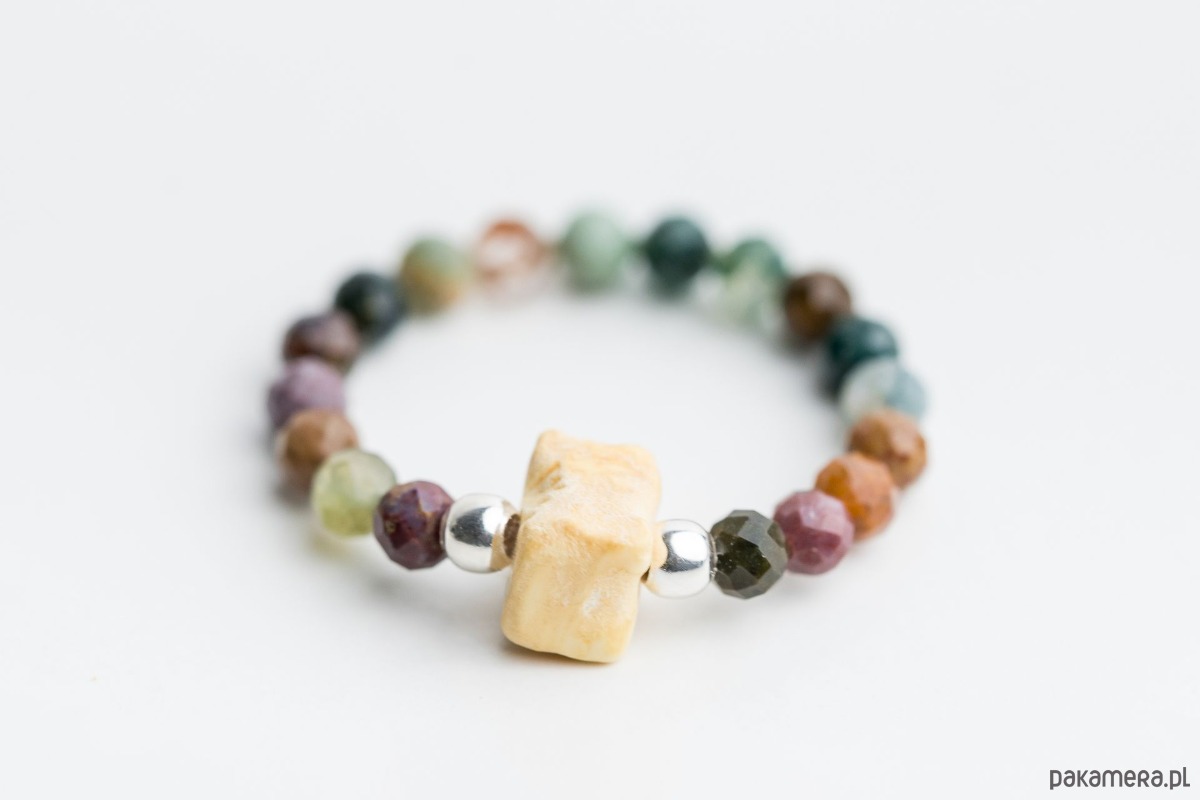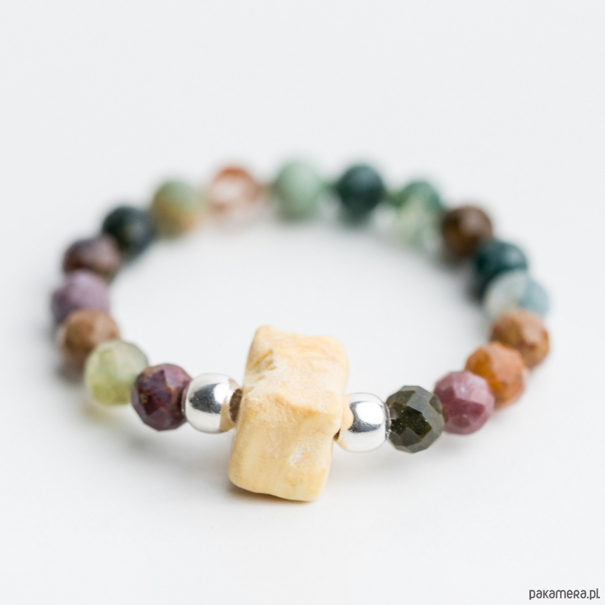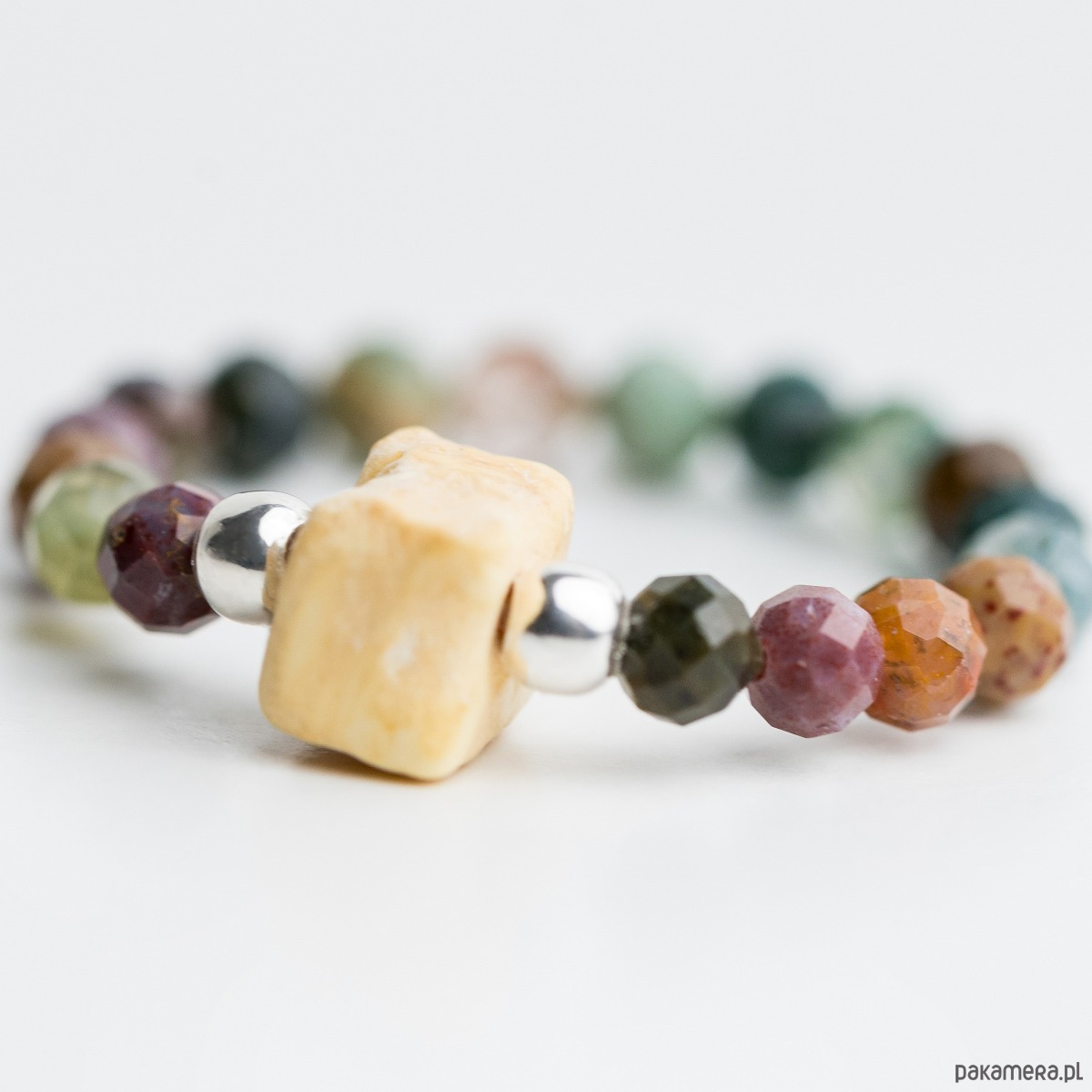 Materiały: bursztyn bałtycki, srebro próba 925, kamienie naturalne, elastyczna gumka