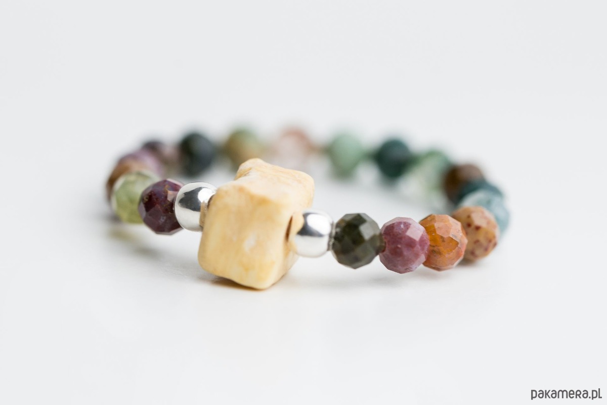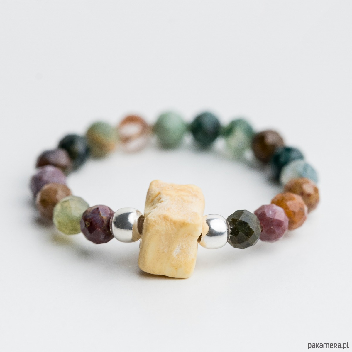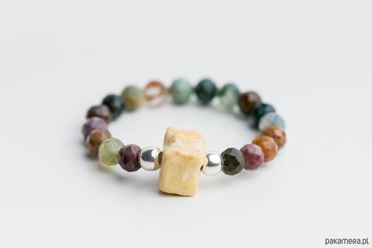 Materiały: bursztyn bałtycki, srebro próba 925, kamienie naturalne, elastyczna gumka