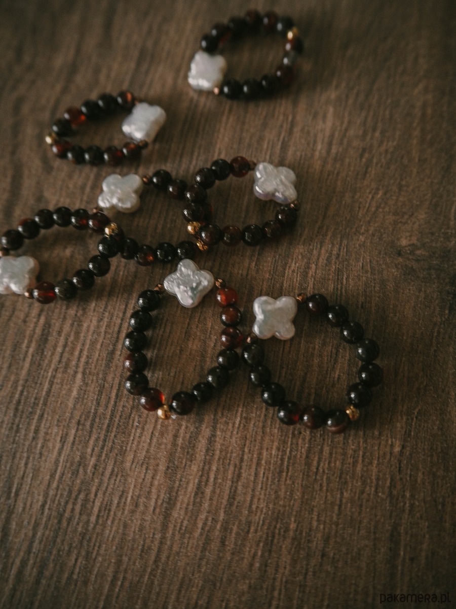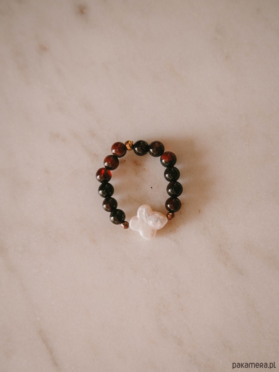 Pierścionek elastyczny Ginger został zrobiony ręcznie z dbałością o każdy mały detal, dzięki czemu możesz cieszyć się wyjątkowym rękodziełem na co dzień. Do wykonania pierścionka zostały użyte kamienie naturalne granat o okrągłym kształcie oraz koniczyna z perły naturalnej.