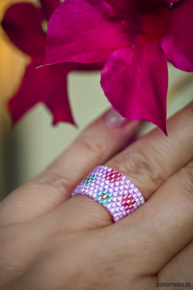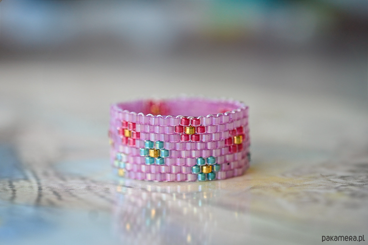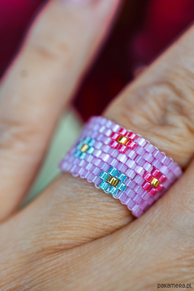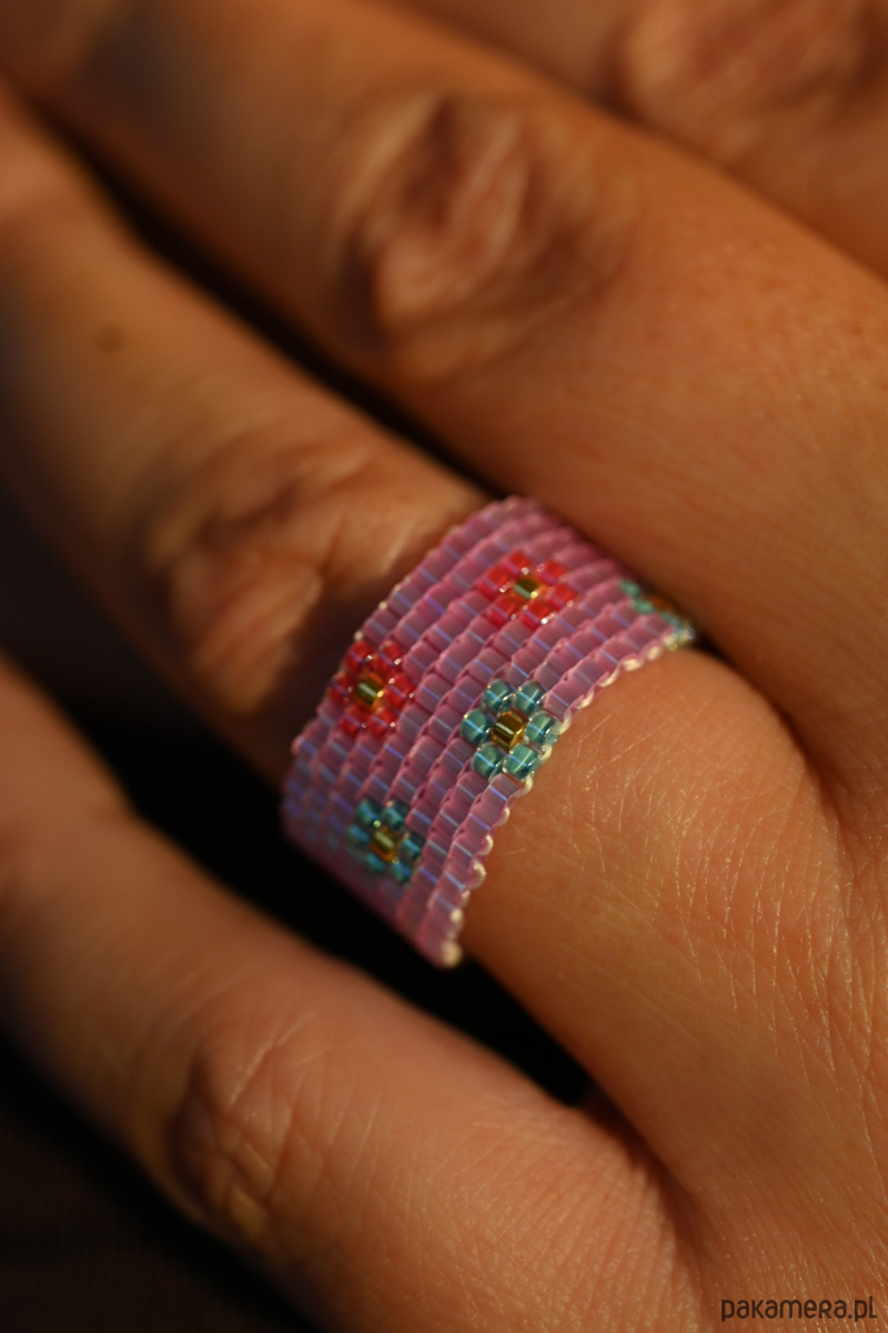Odkryj wyjątkowy, ręcznie pleciony pierścionek z kolekcji EMMa, który z pewnością przyciągnie spojrzenia i zbierze wiele komplementów. Ten 8-rzędowy, wielokolorowy pierścionek wykonany jest z najwyższej jakości japońskich szklanych koralików Miyuki Delica, tworząc uroczy wzór kwiatków w stylu boho.