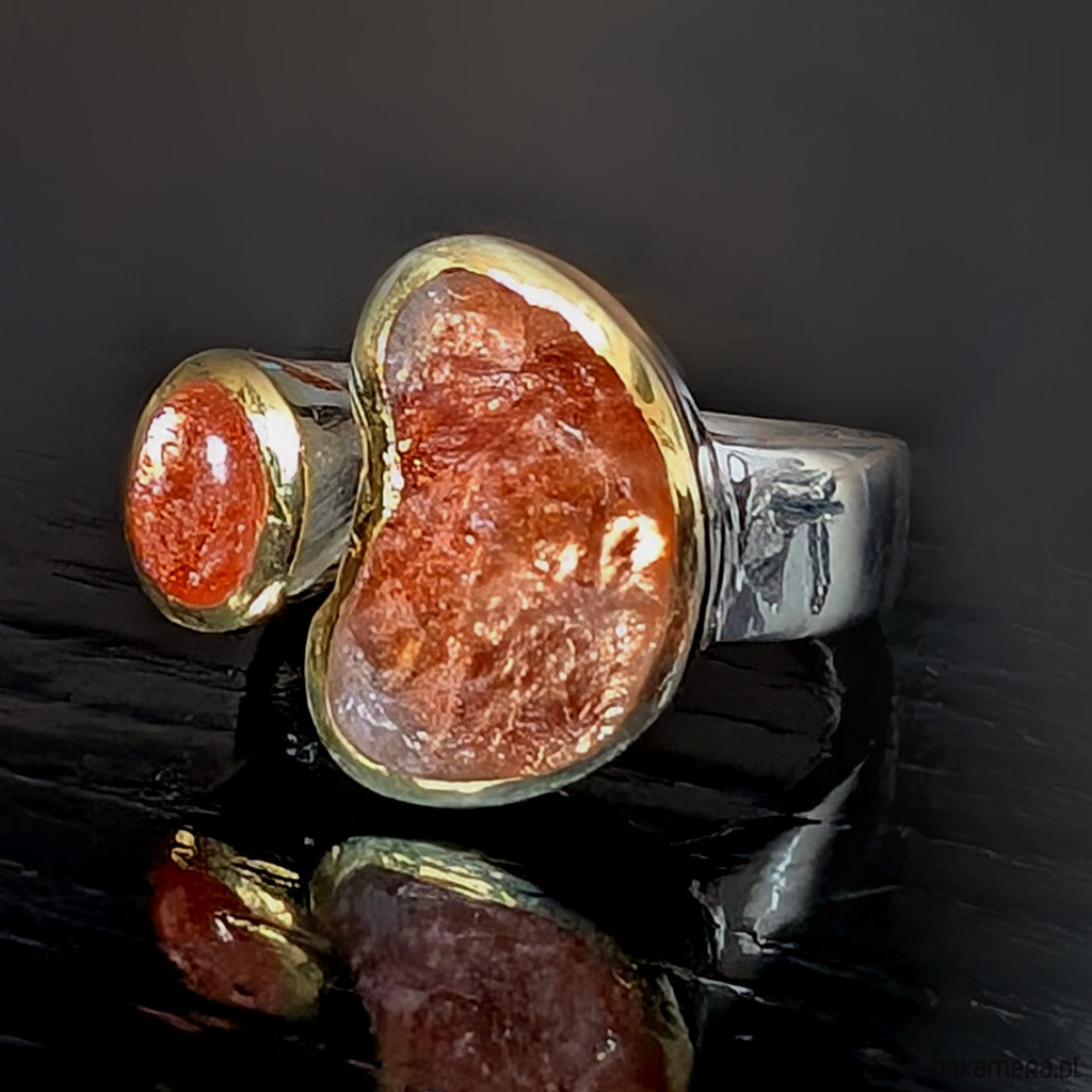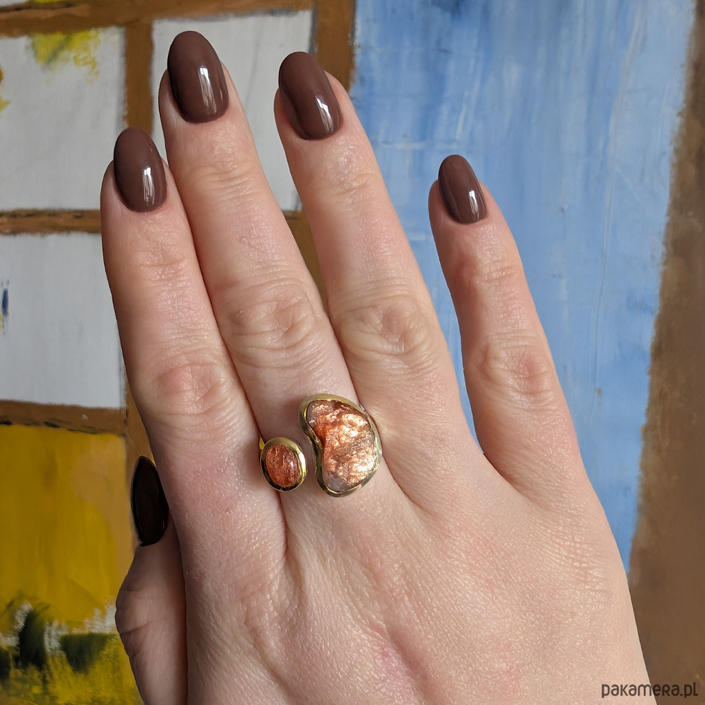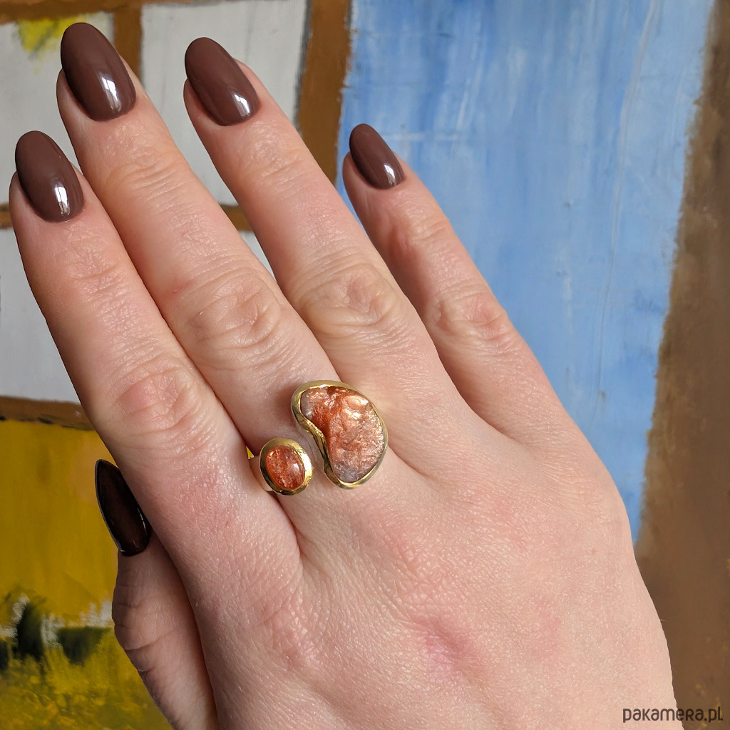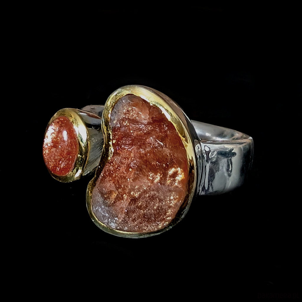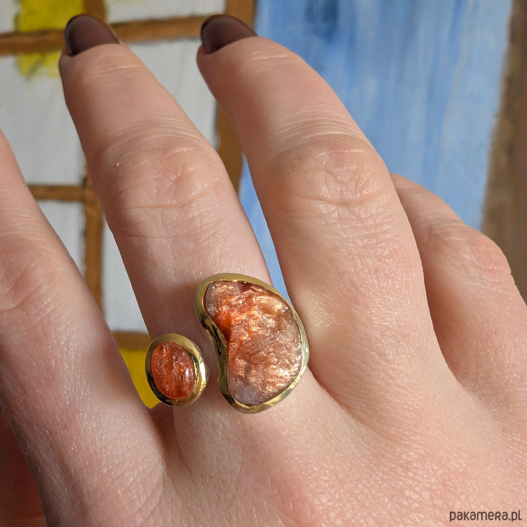 Pierścień z oprawionymi w srebro próby 925 pięknymi, rzadkimi kamieniami słonecznymi zwanymi również skaleniami awenturynowymi. Przepiękny blask kamieni, zwłaszcza ten surowy niezwykle się mieni. Szerokość obrączki max 6 mm, min. 3 mm. Większy kamień ma oprawę 17 x 12 mm. Towarzyszy mu piękny kaboszon sunstone w oprawie 9 x 7 mm. Srebro w oprawie kamieni złocone, są to delikatne powłoki, które z czasem mogą się ścierać. Rozmiar jubilerski regulowany w wąskim zakresie, 13-19 proszę napisać na jaki ustawić. Waga 10,5 grama. Wykonany przez dostawcę kamieni. Pierścień zapakowany zostanie w ozdobne pudełeczko.
