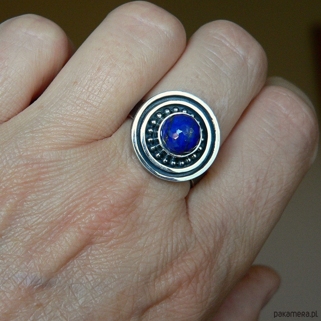 Pierścionek wykonany ze srebra , sercem pierścionka jest naturalny, fasetowany lapis lazuli / klasa AA, z żyłkami pirytu/w efektownej, oksydowanej i mocno polerowanej oprawie . Średnica kamienia 8 mm, średnica frontu 19 mm Obrączka regulowana /do rozmiaru 20/, przy zakupie proszę o podanie noszonego rozmiaru, ustawię obrączkę.