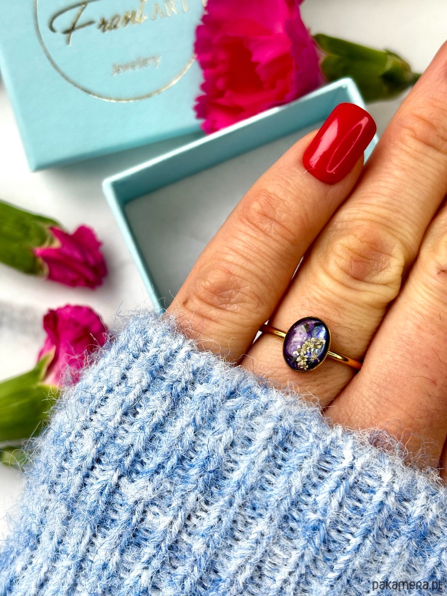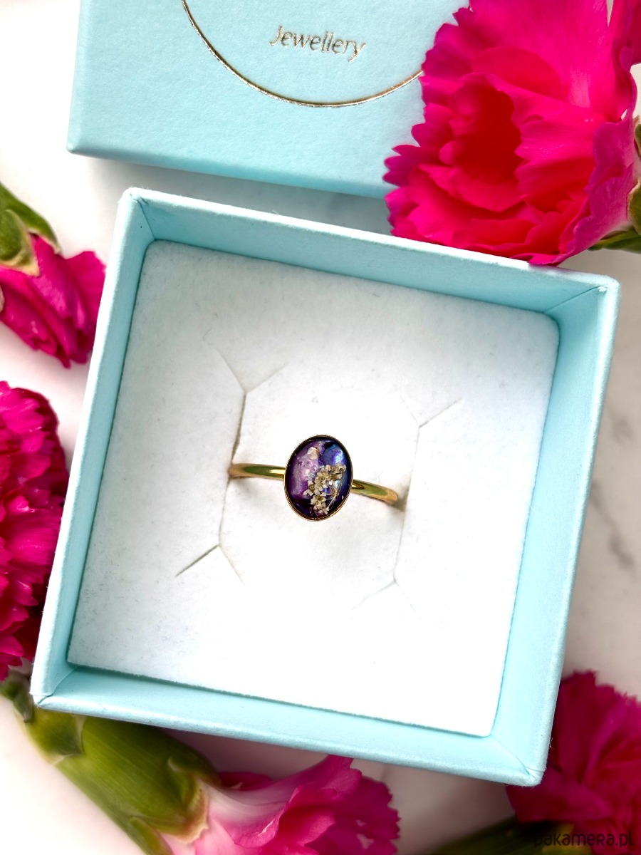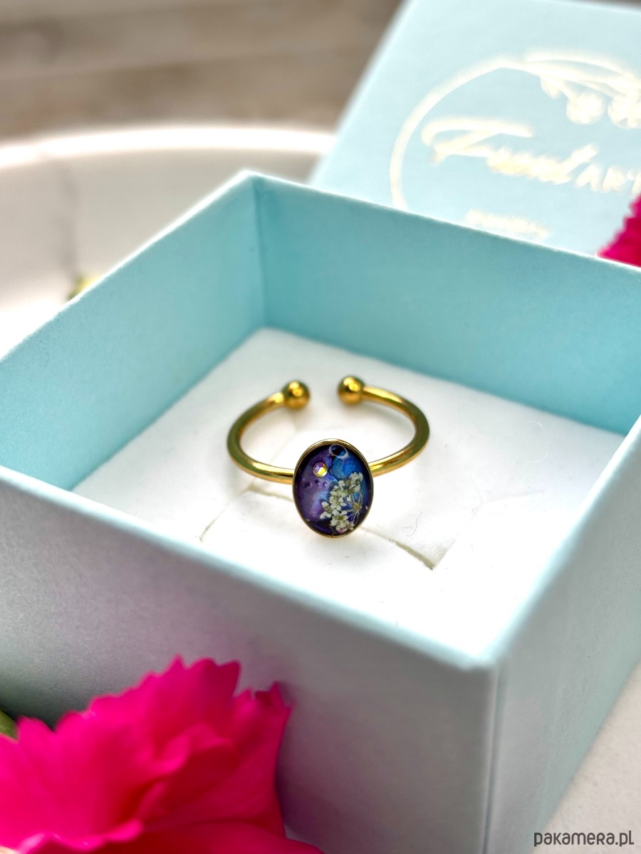 Ręcznie wykonany pierścionek z oczkiem w kształcie owalu. Biżuteria wykonana jest z wyselekcjonowanych kawałków muszli w w kolorze fioletu, suszonych kwiatów dzikiej marchwi oraz cyrkonii swarovskiego. Pierścionek pięknie prezentuje się na dłoni, dzięki możliwości regulacji można dopasować go do większości placów.