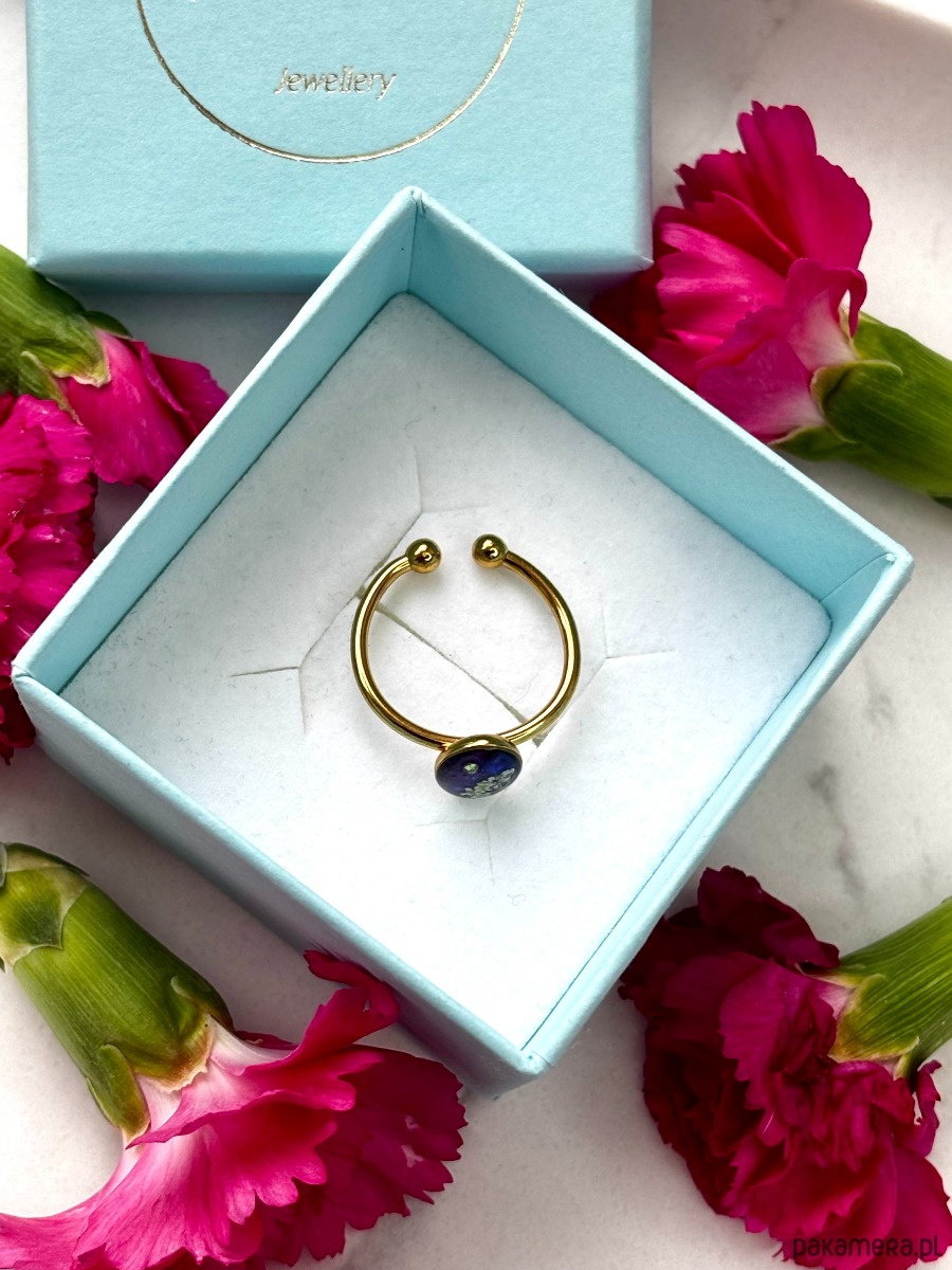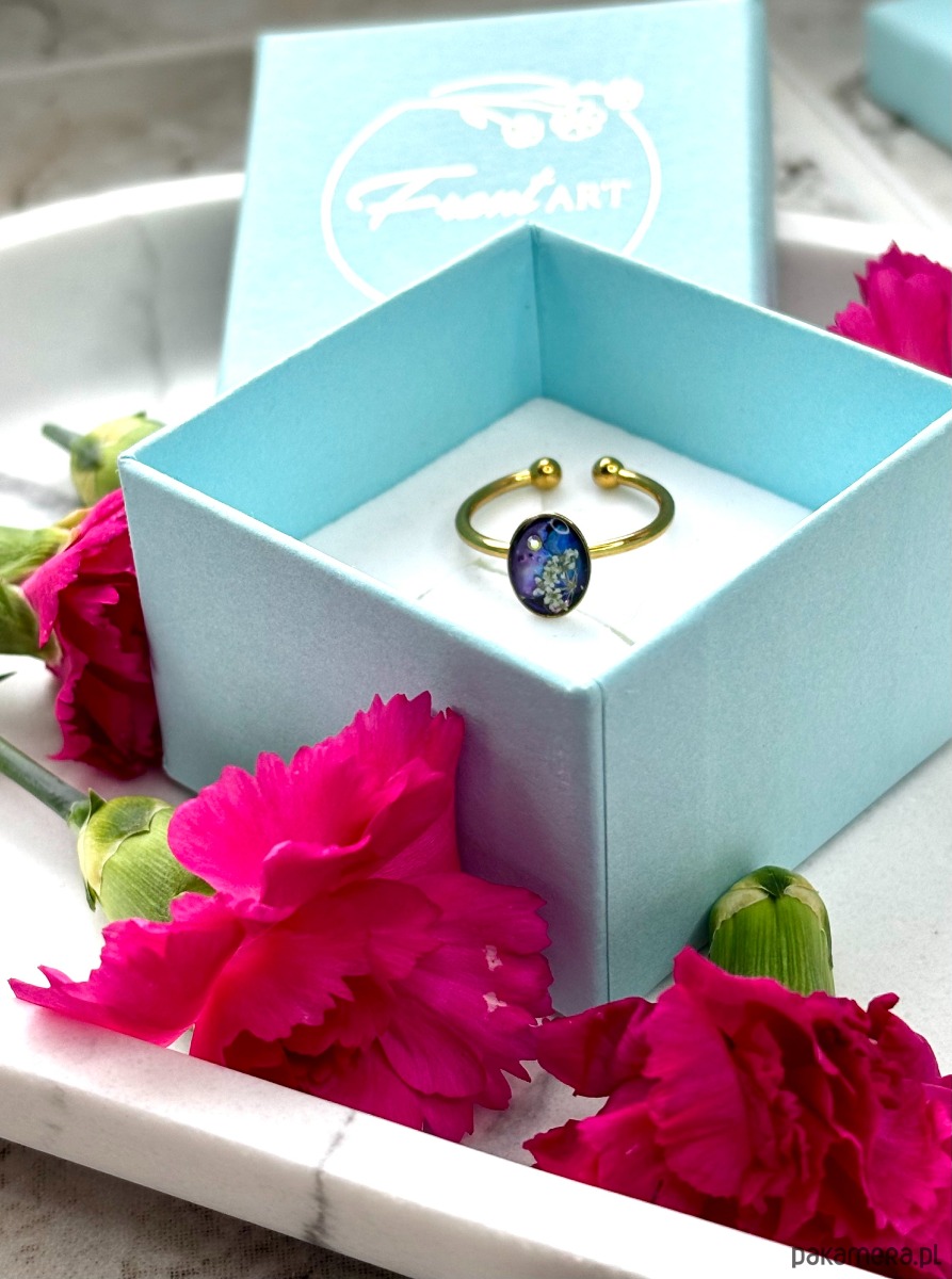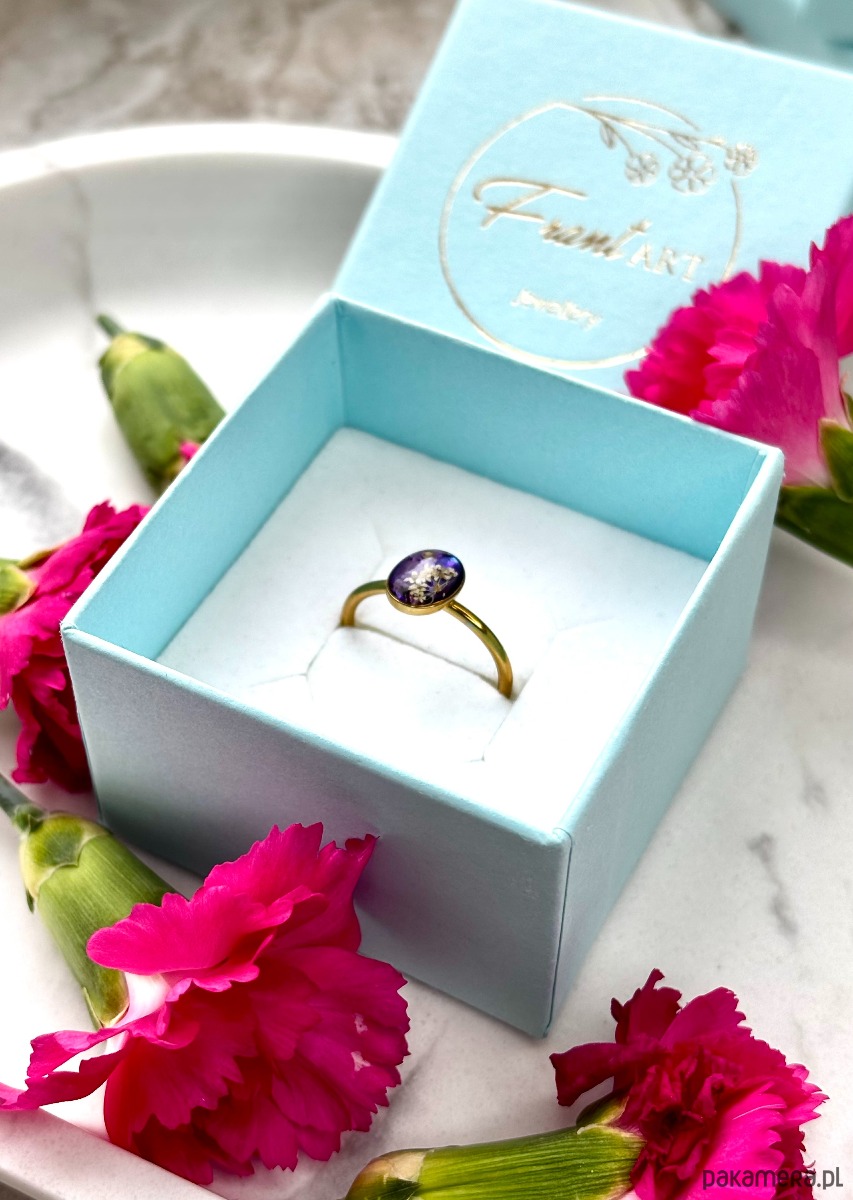 Ręcznie wykonany pierścionek z oczkiem w kształcie owalu. Biżuteria wykonana jest z wyselekcjonowanych kawałków muszli w w kolorze fioletu, suszonych kwiatów dzikiej marchwi oraz cyrkonii swarovskiego. Pierścionek pięknie prezentuje się na dłoni, dzięki możliwości regulacji można dopasować go do większości placów.