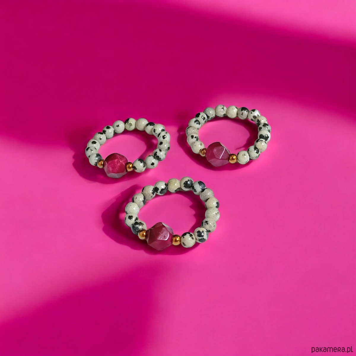 Pierścionek elastyczny został wykonany z drobniutkich kuleczek jaspisu dalmatyńskiego 3mm, przekładek ze złotego hematytu oraz kontrastujących, fasetowanych kul tygrysiego oka w soczystym odcieniu fuksji (6mm)