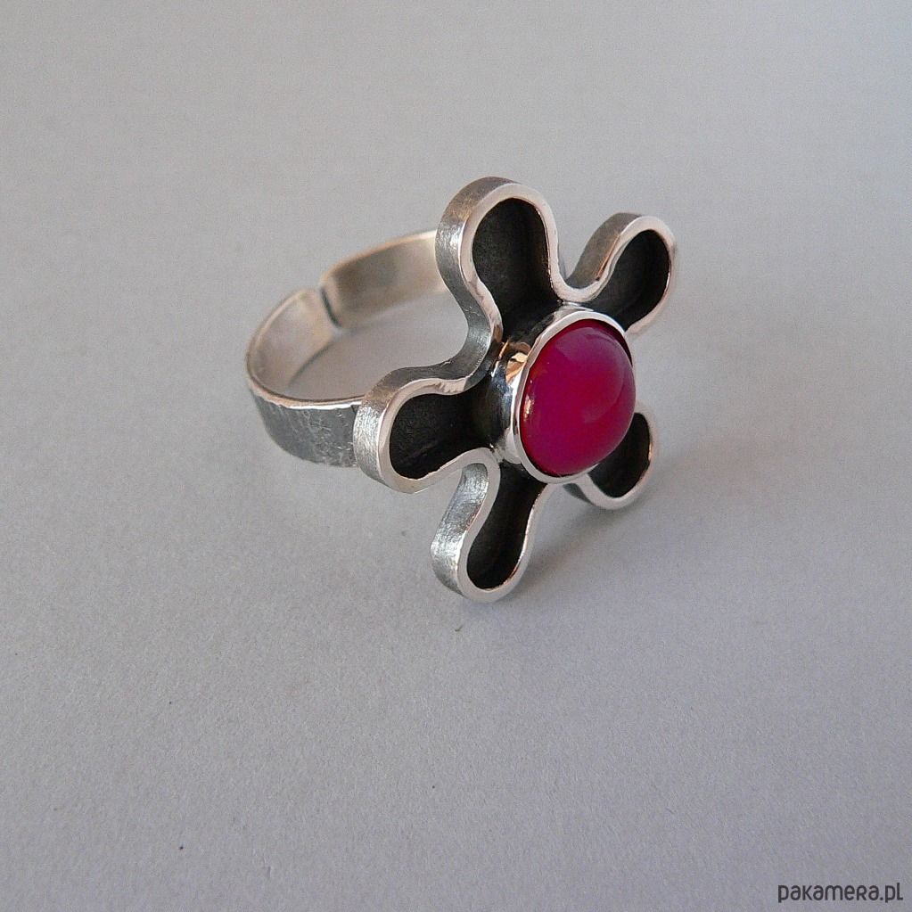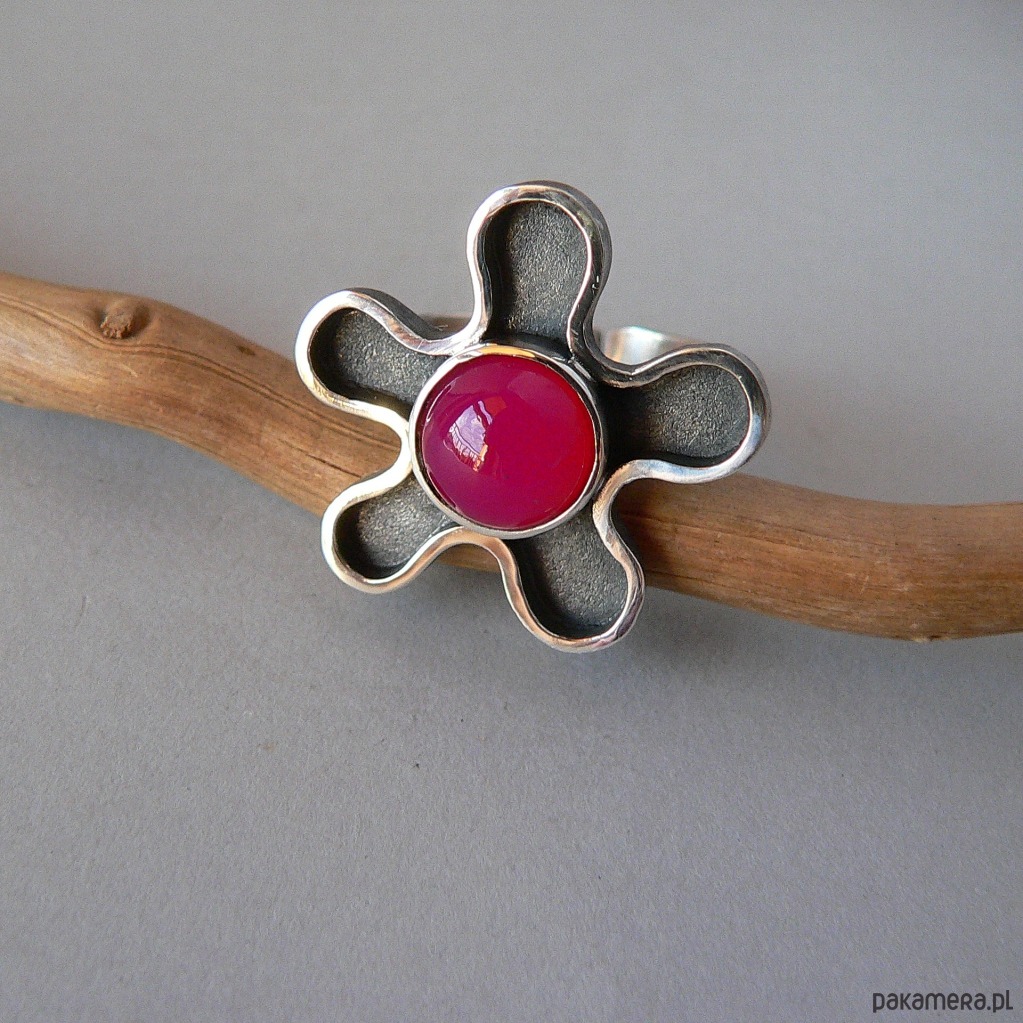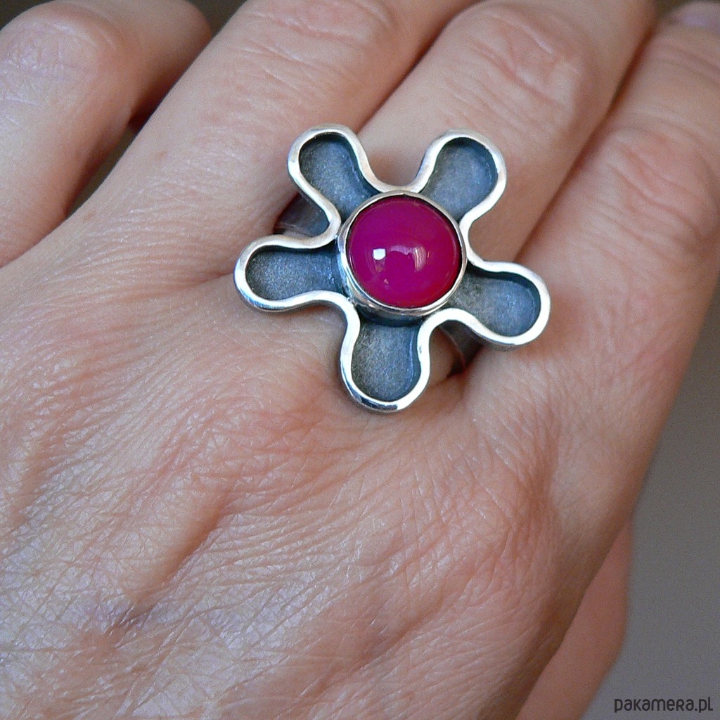 Asymetryczny pierścionek wykonany ze srebra i agatu w kolorze fuksji/ciemny róż. Średnica kamienia 10 mm, Wymiary nieregularnego frontu 2,7/2,7 cm Srebro oksydowane, detale polerowane. Rozmiar regulowany, przy zakupie proszę o podanie noszonego rozmiaru, ustawię obrączkę.