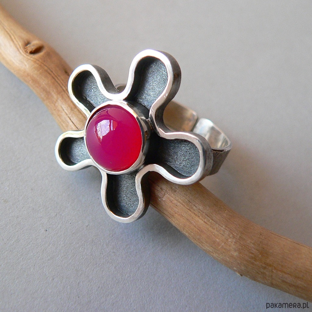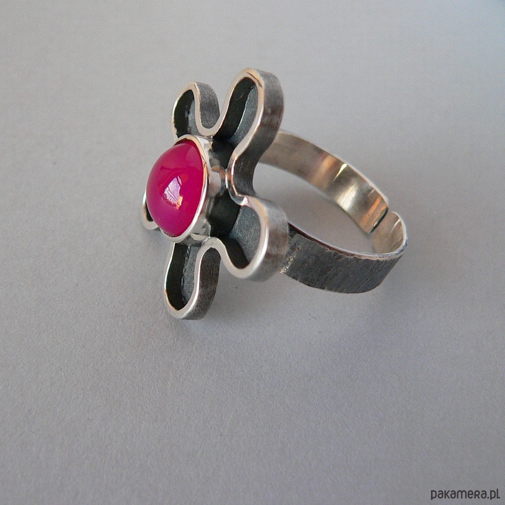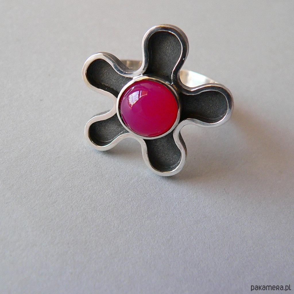 Asymetryczny pierścionek wykonany ze srebra i agatu w kolorze fuksji/ciemny róż. Średnica kamienia 10 mm, Wymiary nieregularnego frontu 2,7/2,7 cm Srebro oksydowane, detale polerowane. Rozmiar regulowany, przy zakupie proszę o podanie noszonego rozmiaru, ustawię obrączkę.