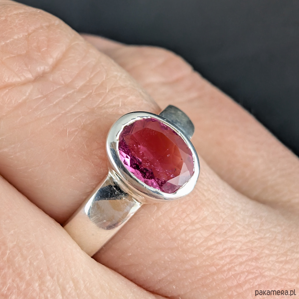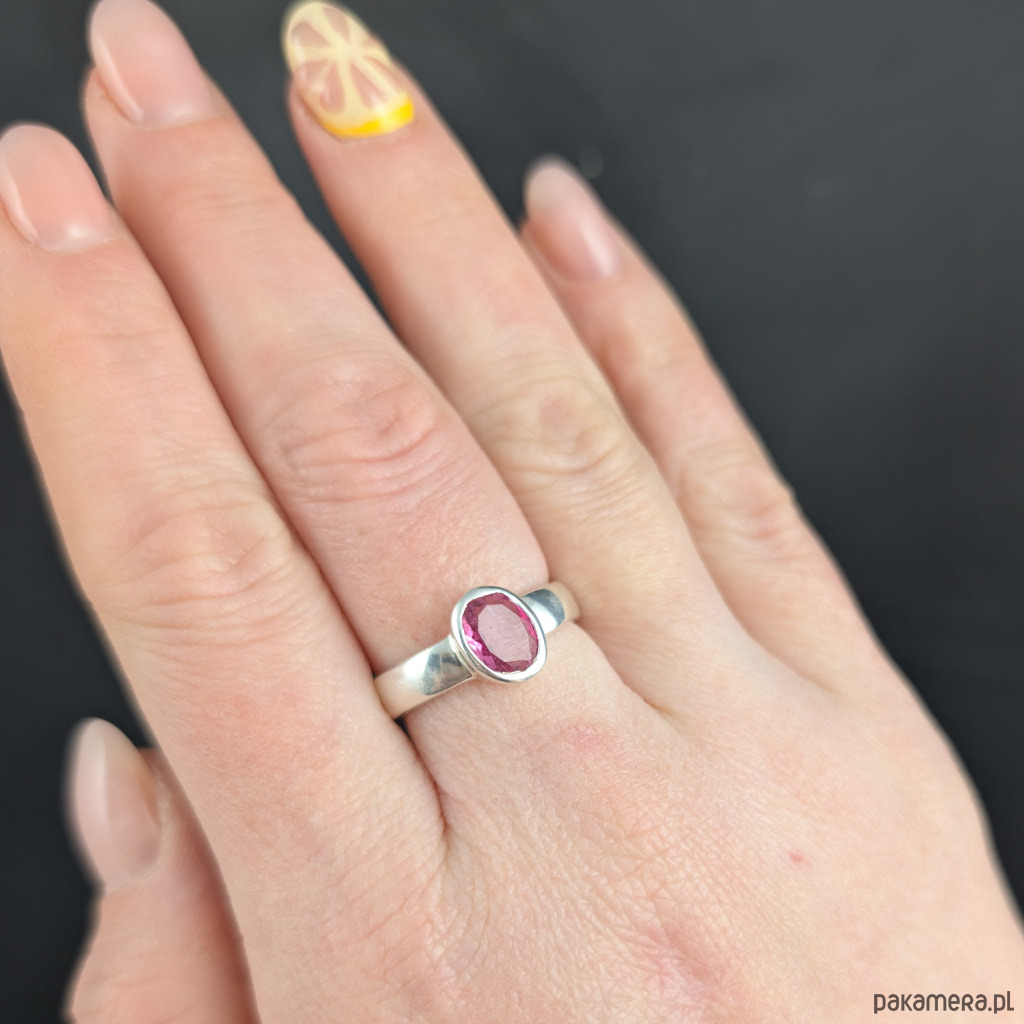 Pierścień z oprawionym w srebro próby 925 pięknym, fasetowanym turmalinem w odcieniu intensywnego różu. Szerokość obrączki 4 mm. Kamień ma oprawę 9 x 7 mm. Rozmiar jubilerski 15. Mogę powiększyć na max. 16. Waga 4,5 grama. Wykonany przez dostawcę kamieni. Pierścień zapakowany zostanie w ozdobne pudełeczko.
