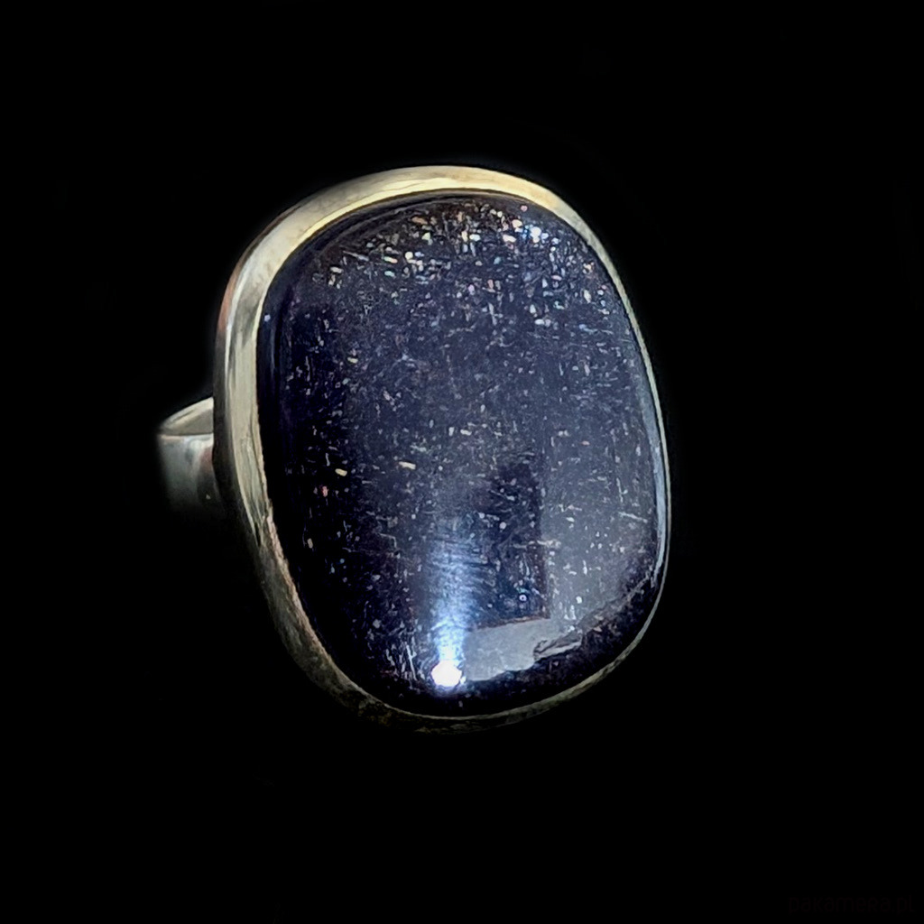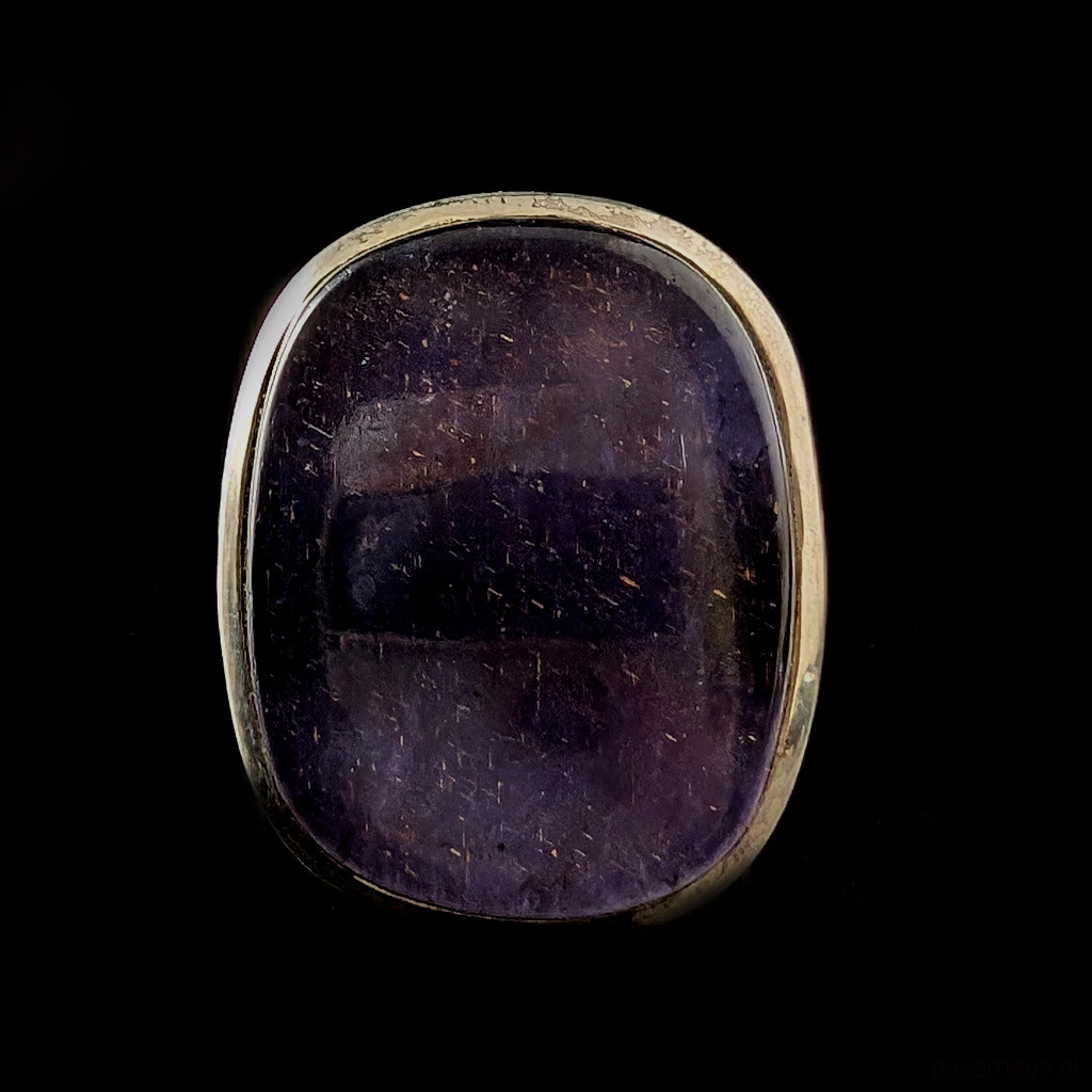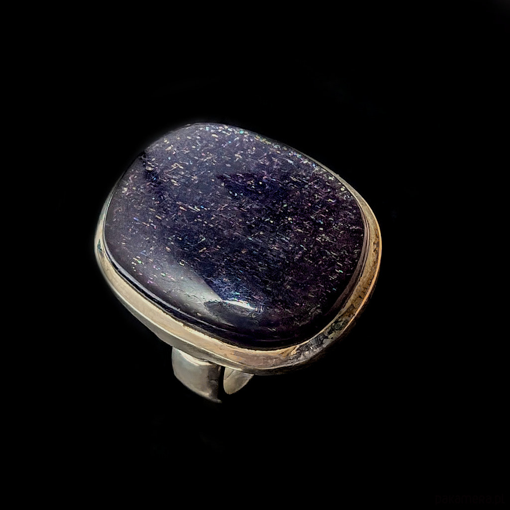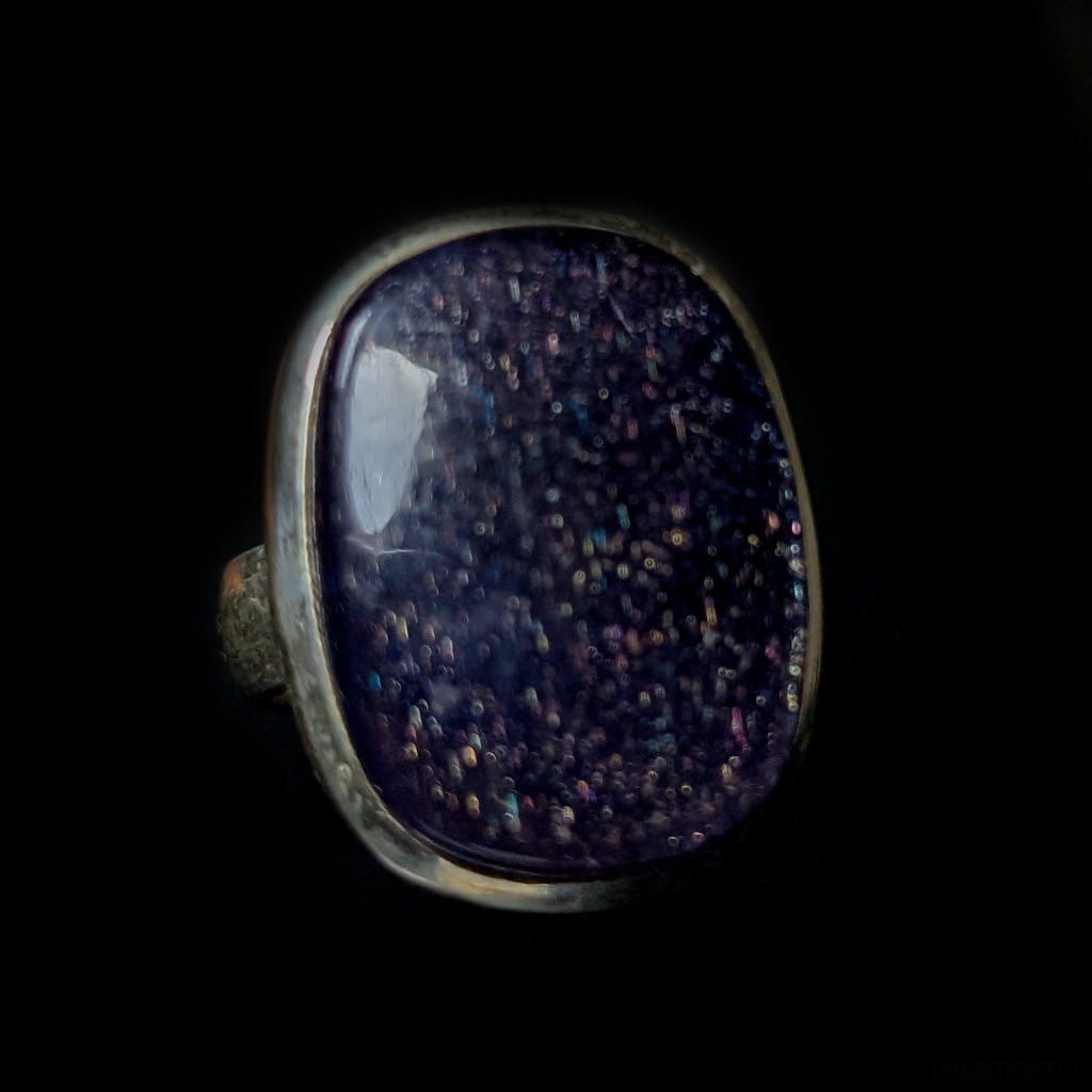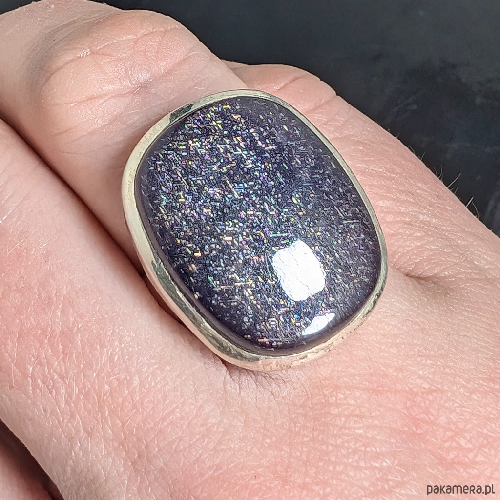 Pierścień wykonany ze srebra próby 925, który zdobi wyjątkowy okaz kamienia słonecznego w iolicie. Rzadki minerał wykazujący tzw.efekt awenturyzacji w postaci maleńkich mieniących się wrostów- łusek innych minerałów,np.hematytu. Niezwykle mienią się w słońcu. Ciekawe i atrakcyjne połączenie dwóch minerałów. Kamień ma oprawę 25 x 21 mm. Pierścionek w rozmiarze jubilerskim 14. Waga 11 g. Wykonany przez dostawcę kamieni.