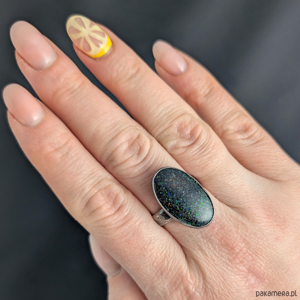 Pierścień z oksydowanego srebra 925 oraz niezwykłego opalu australijskiego black matrix. Wymiary oprawy 25 x 15 mm. Rozmiar jubilerski regulowany w szerokim zakresie, proszę napiać na jaki dopasować (10-25), obrączka ma 5 mm szerokości. Waga 7,37 grama. Pierścień zapakowany w ozdobne pudełeczko.