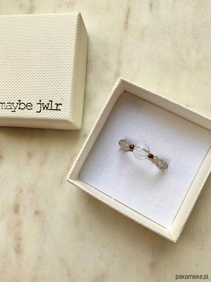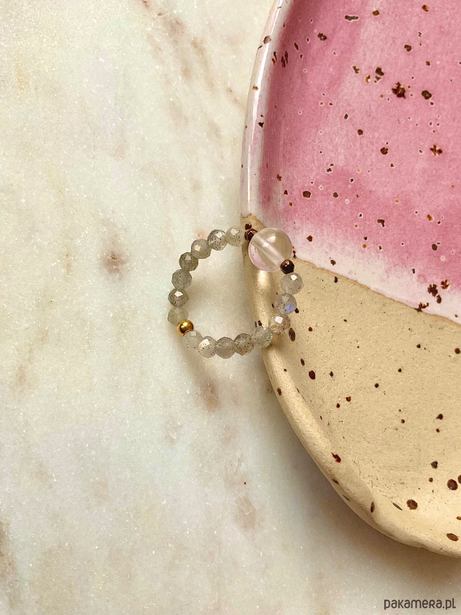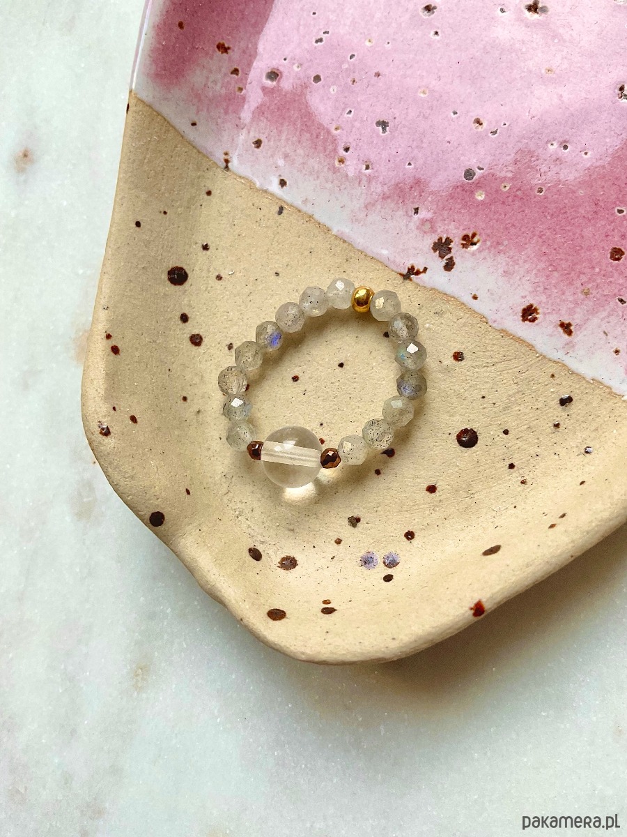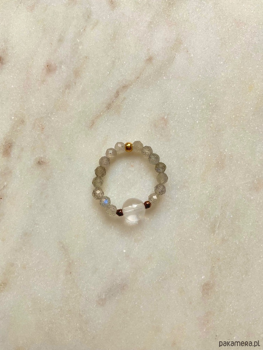 Pierścionek na gumce jubilerskiej wykonany z hematytu, labradorytu, kuli kryształu górskiego oraz kuleczki ze stali chirurgicznej.
