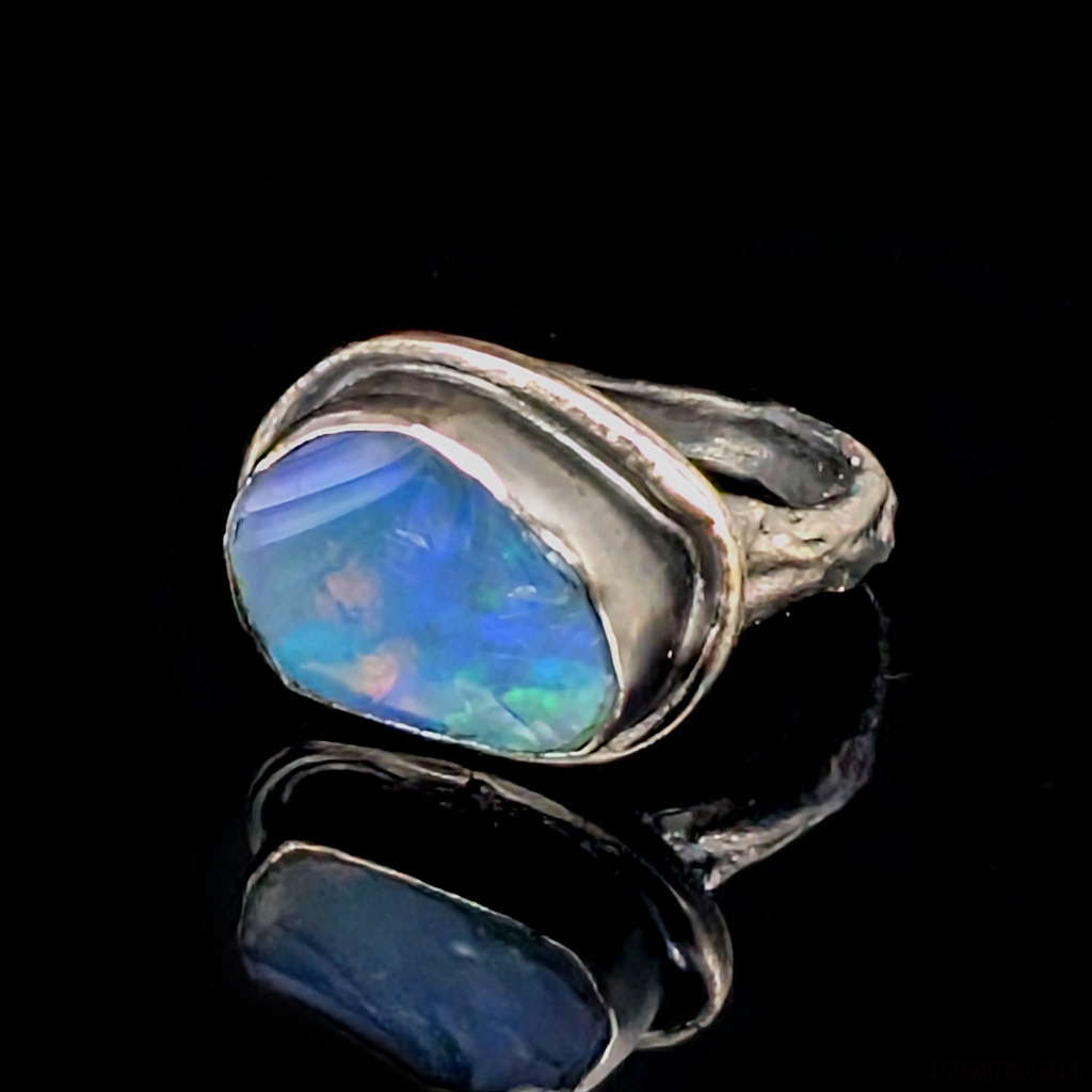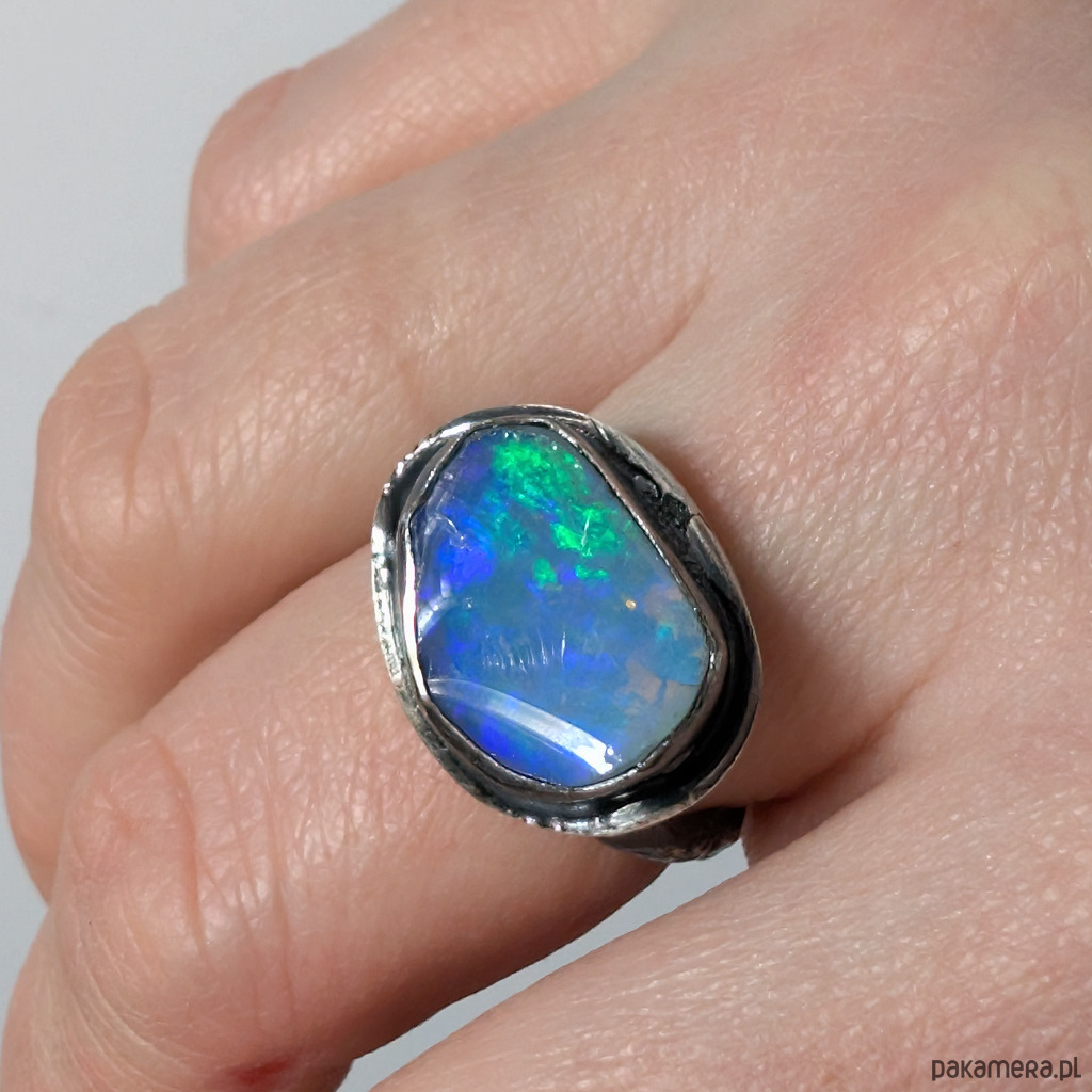 Pierścionek wykonany ze srebra próby 925, oksydowane, przetarte, fakturowane. Rozmiar pierścionka dzięki otwartej podstawie regulowany, z łatwością można dopasować na dowolny rozmiar w zakresie 9-23. Proszę napisać, na jaki ustawić. Ozdobą pierścionka jest piękny, szlachetny opal z Etiopii. Wymiary oprawy kamienia 18 x 15 mm, szerokość maksymalna obrączki 6 mm, min. 4 mm. Waga 7,4 g. Pierścień zostanie zapakowany w ozdobne pudełeczko.