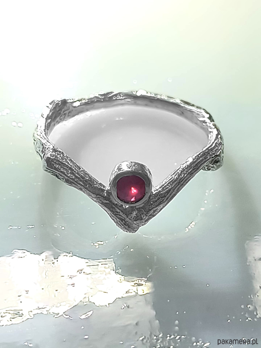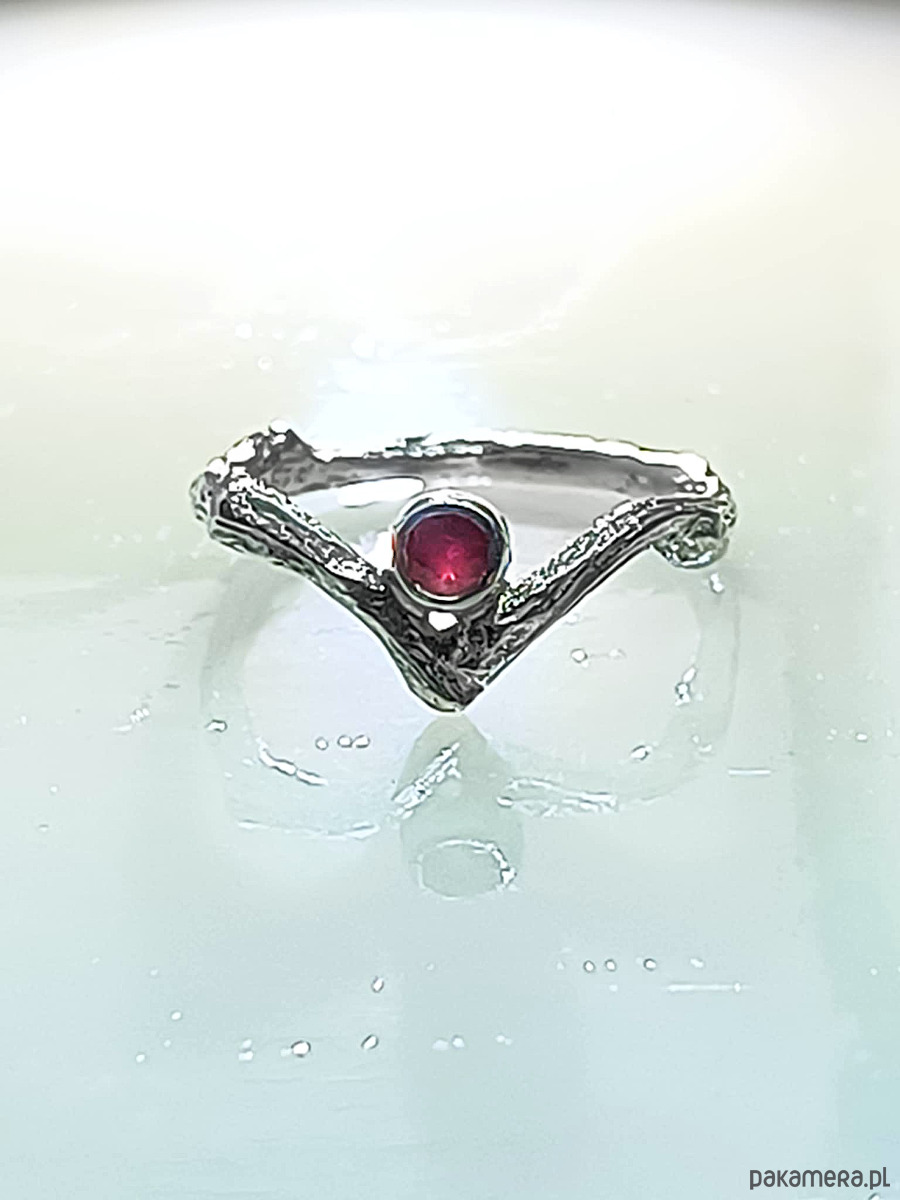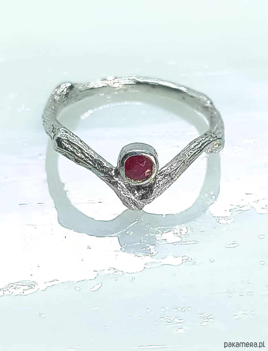 Pierścionek GAŁĄZKA z Rubinem jest próbą zatrzymania natury w jej najpiękniejszym stadium. Dzięki swej nietypowej formie, pierścionek. z gracją oplata palec, jego wyjątkowy kształt wysmukla, a faktura cudownie rozprasza światło. Sercem pierścionka jest naturalny rubin o pięknej różowej barwie.