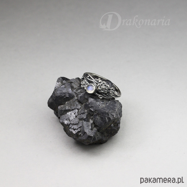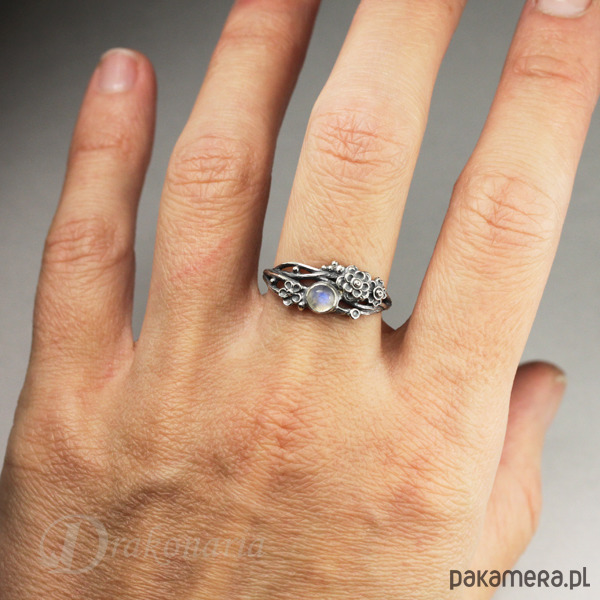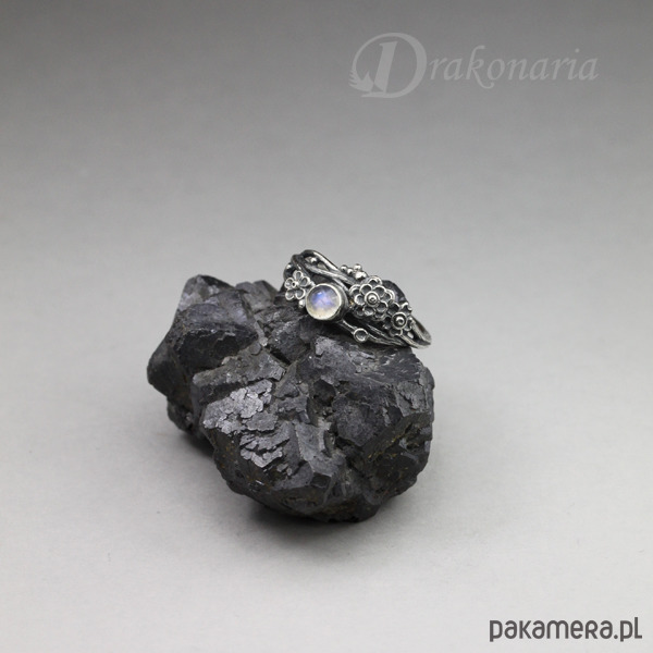 Romantyczny, organiczny pierścionek, wykonany ze srebra pr 925, ozdobiony niezwykle drobnymi kwiatami i kamieniem księżycowym, pochodzący z kolekcji "Gałązki". Oksydowany, przecierany i polerowany dla uwydatnienia delikatnych detali.