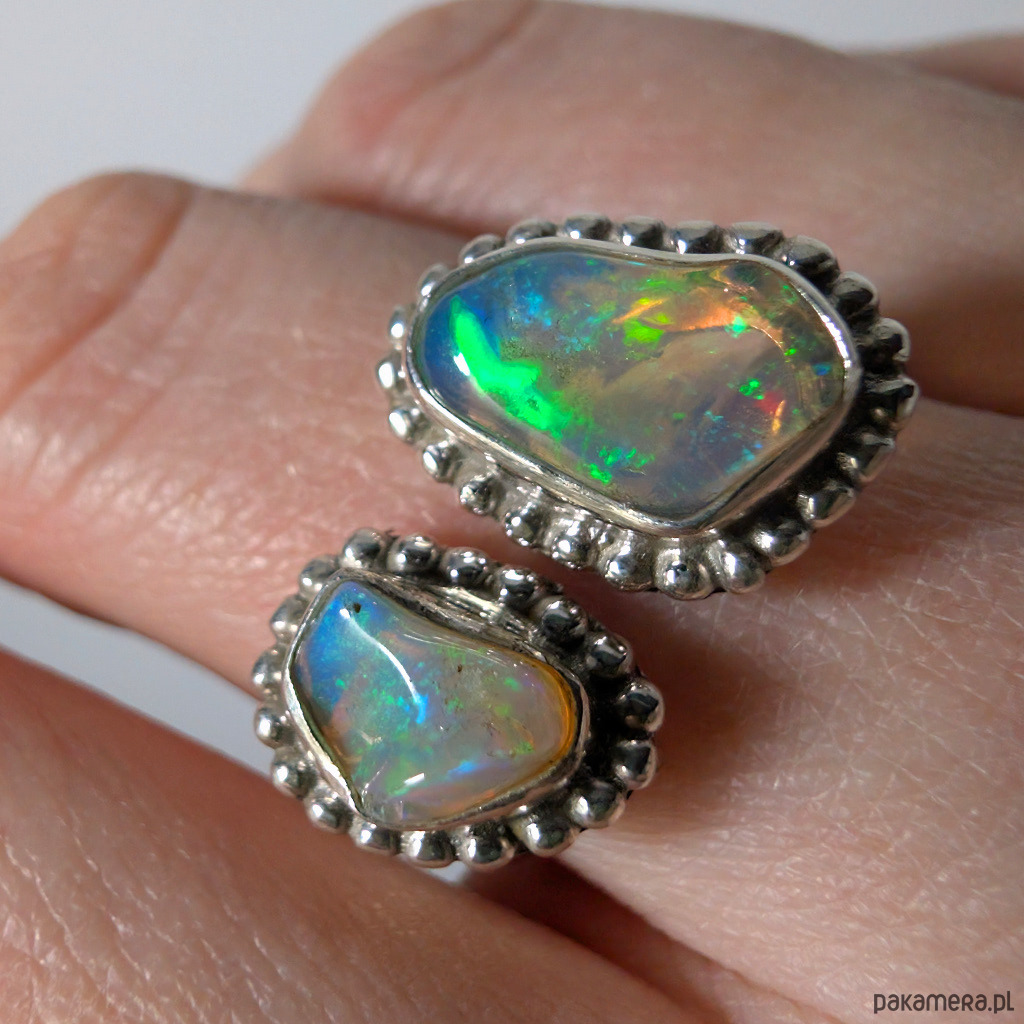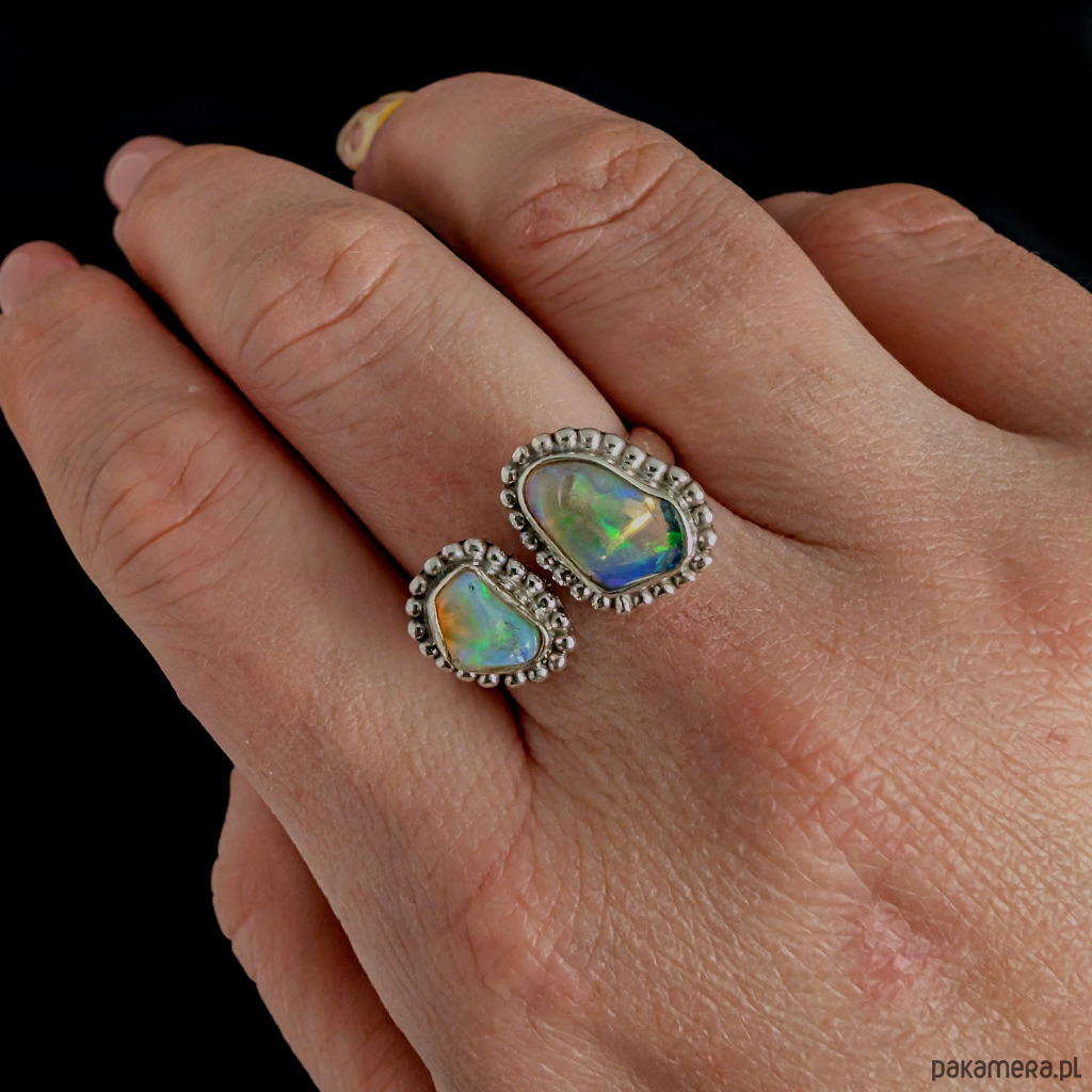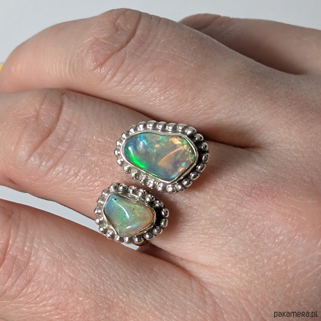 Pierścień zjawiskowy, wykonany ze srebra pr. 925 oraz płonących opali z Etiopii w surowej formie i oprawie 14 x 9 mm oraz 10 x 8 mm. Rozmiar jubilerski min 18, max 21. Ustawię odpowiedni, proszę o wiadomość w sprawie rozmiaru. Waga 6,2 g. Wykonany przez dostawcę kamieni. Pierścień zostanie zapakowany w ozdobne pudełeczko.