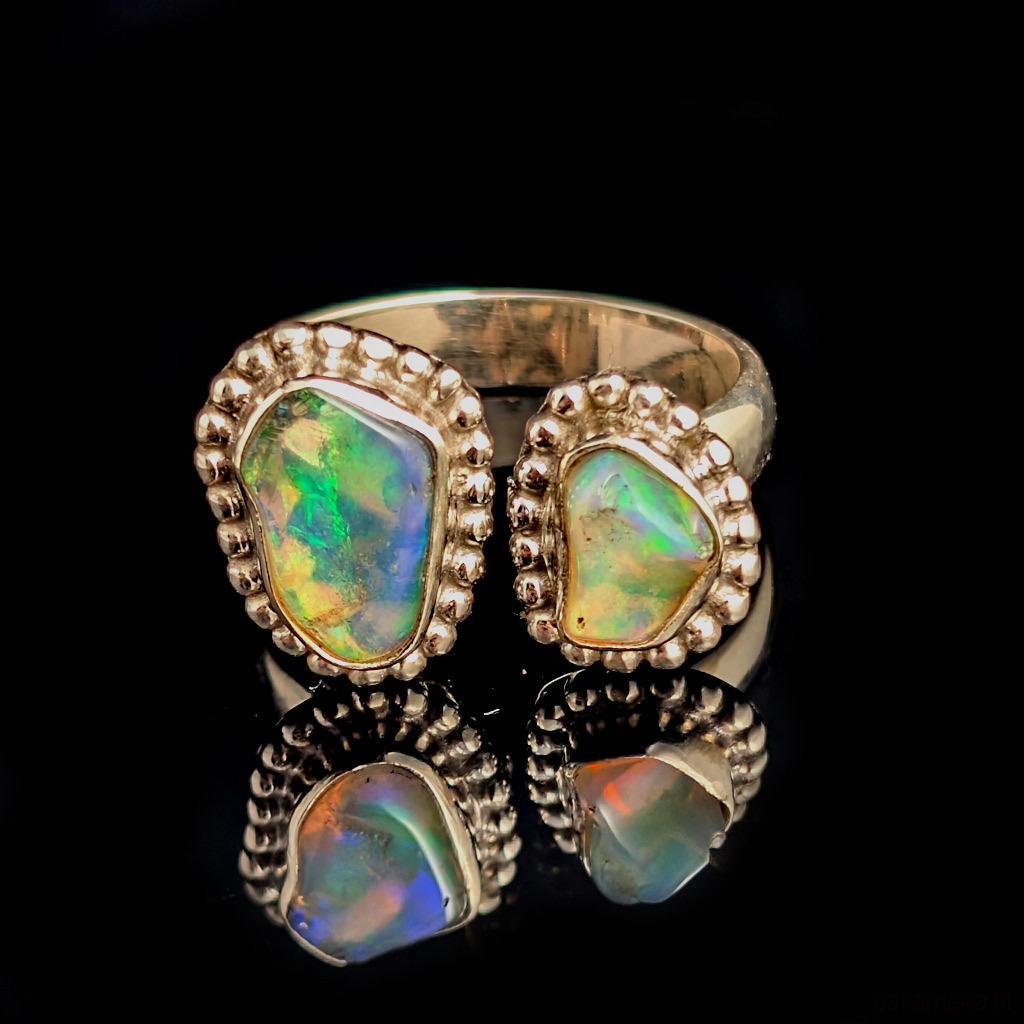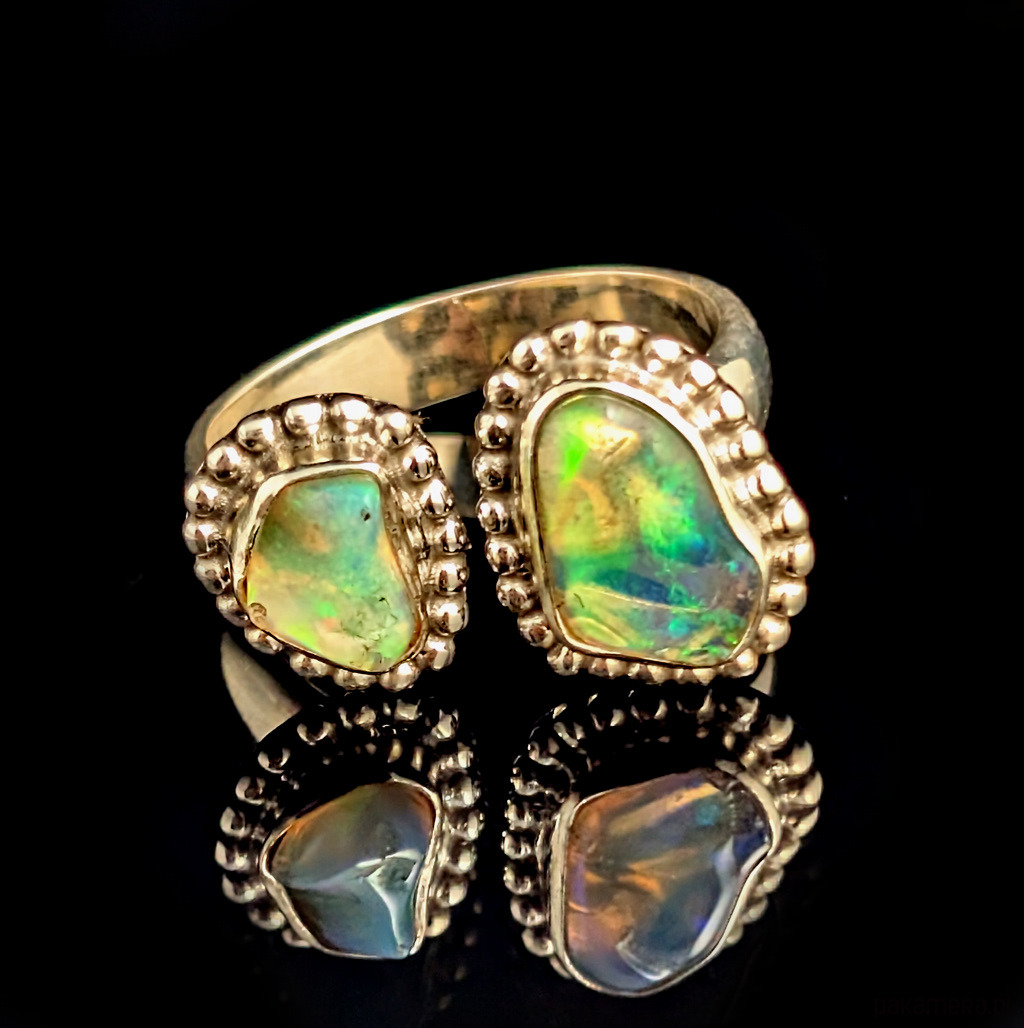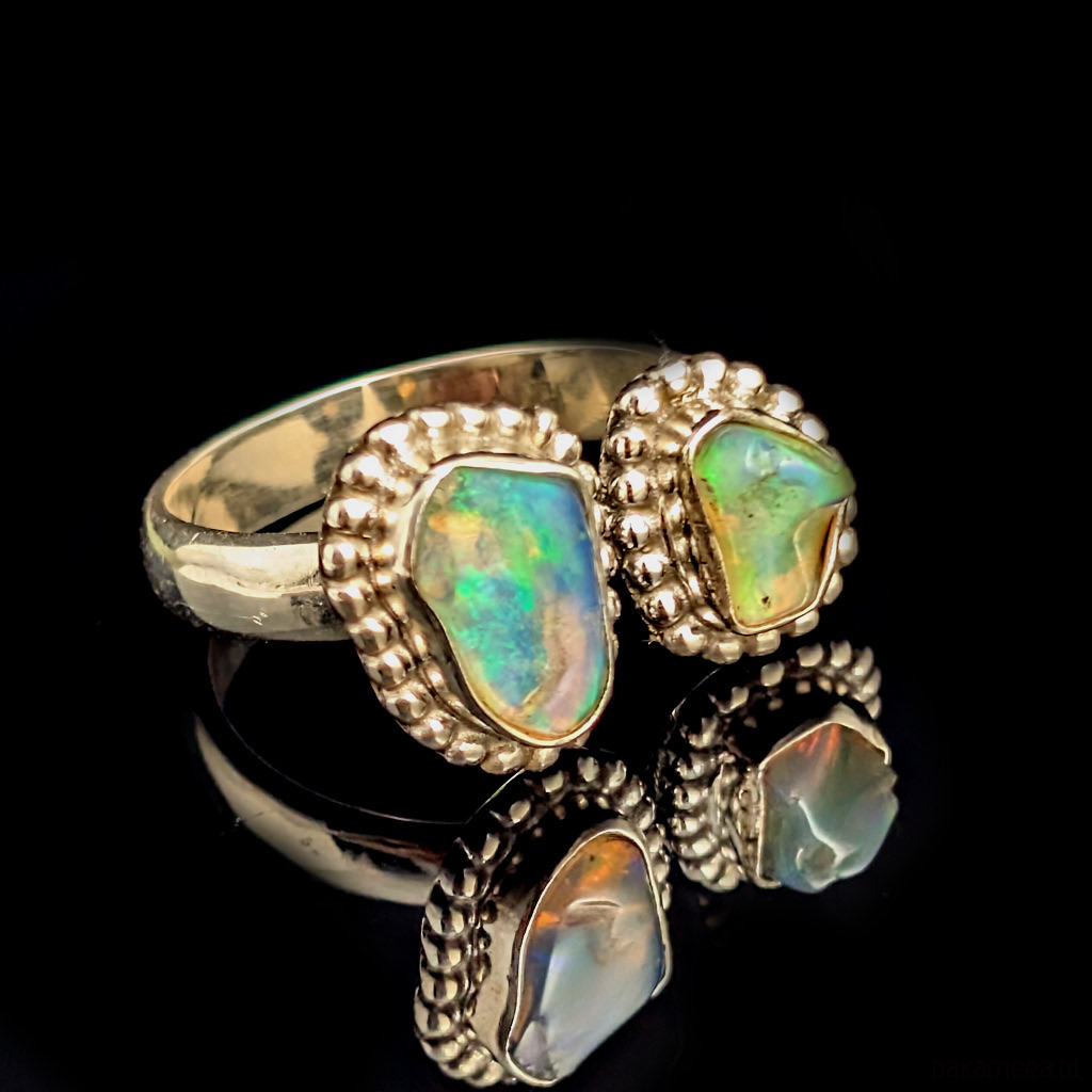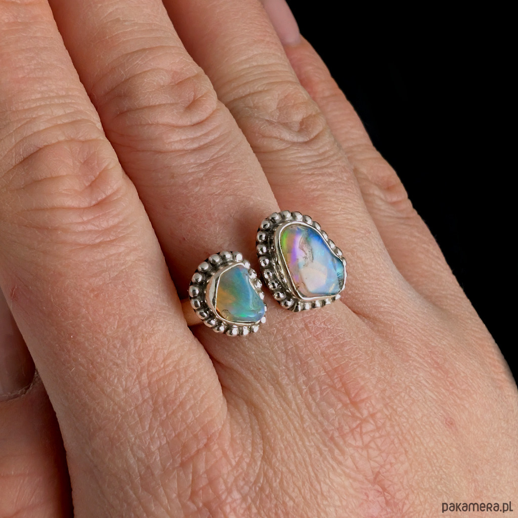 Pierścień zjawiskowy, wykonany ze srebra pr. 925 oraz płonących opali z Etiopii w surowej formie i oprawie 14 x 9 mm oraz 10 x 8 mm. Rozmiar jubilerski min 18, max 21. Ustawię odpowiedni, proszę o wiadomość w sprawie rozmiaru. Waga 6,2 g. Wykonany przez dostawcę kamieni. Pierścień zostanie zapakowany w ozdobne pudełeczko.