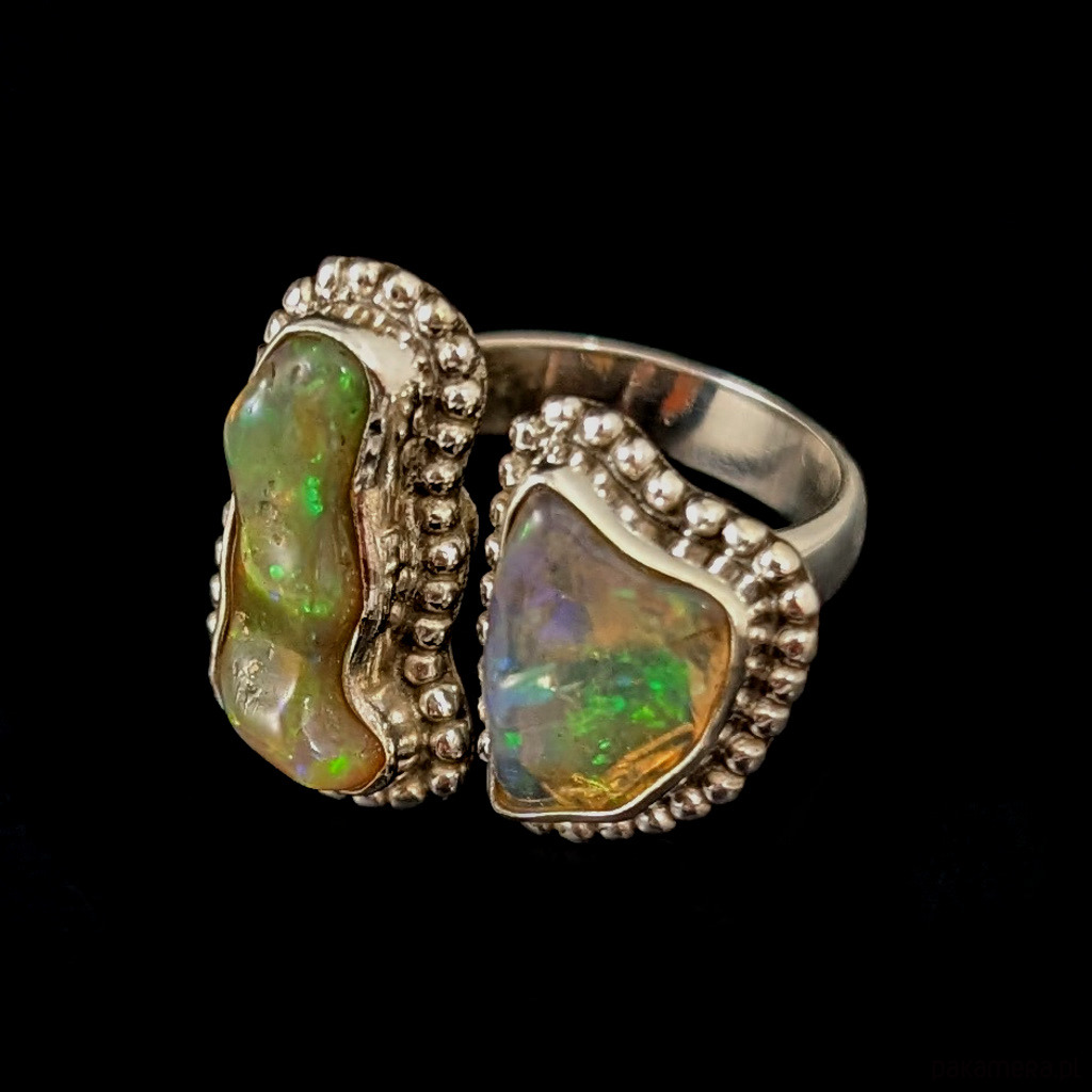 Pierścień niczym bombonierka z cukiereczkami :) Wykonany ze srebra pr. 925 oraz płonących opali z Etiopii w surowej formie i oprawie 20 x 9 mm oraz 15 x 11 mm.  Rozmiar jubilerski min 15, max 17. Ustawię odpowiedni, proszę o wiadomość w sprawie rozmiaru. Waga 8 g. Wykonany przez dostawcę kamieni. Pierścień zostanie zapakowany w ozdobne pudełeczko.