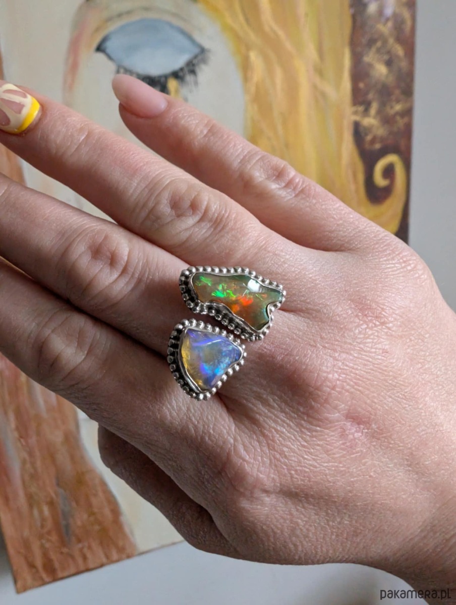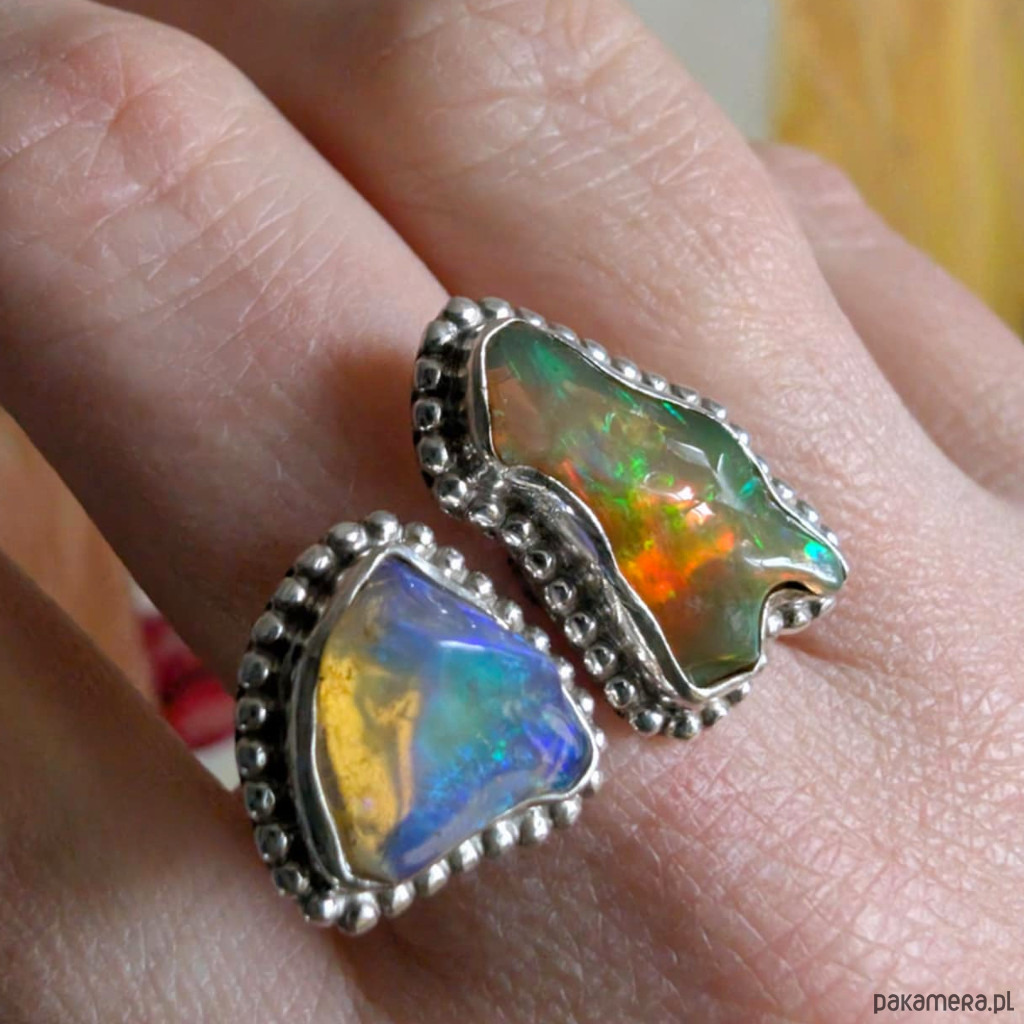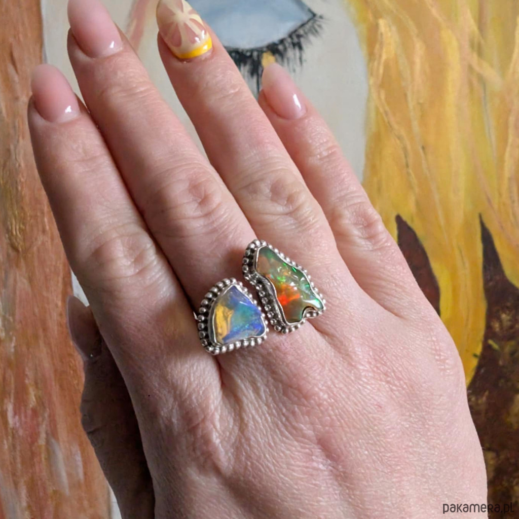 Pierścień zjawiskowy, wykonany ze srebra pr. 925 oraz płonących opali z Etiopii w surowej formie i oprawie 21 x 12 mm oraz 13 x 12 mm. Rozmiar jubilerski min 17, max 20. Ustawię odpowiedni, proszę o wiadomość w sprawie rozmiaru. Waga 8 g. Wykonany przez dostawcę kamieni. Pierścień zostanie zapakowany w ozdobne pudełeczko.