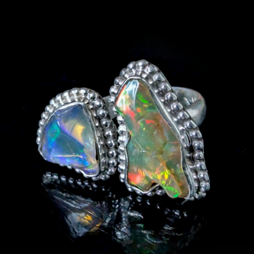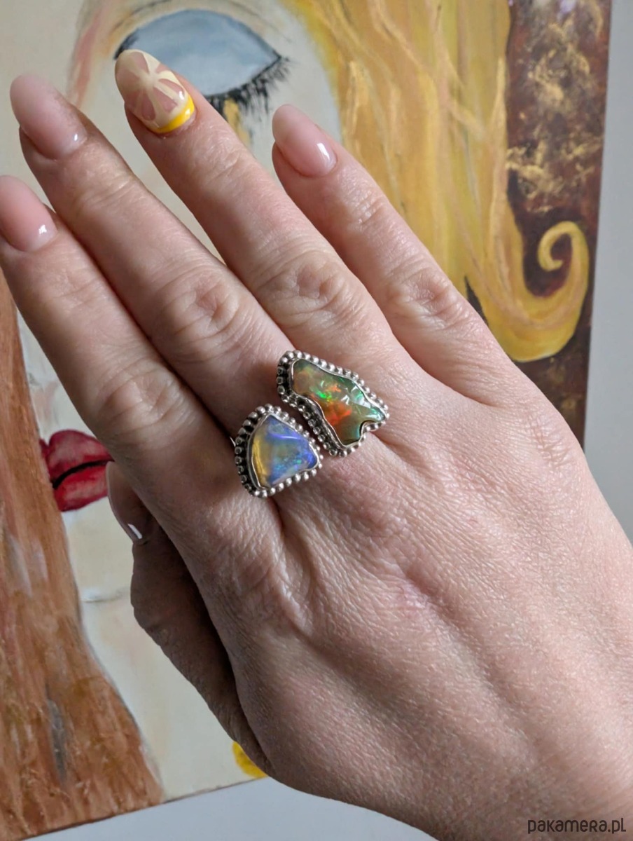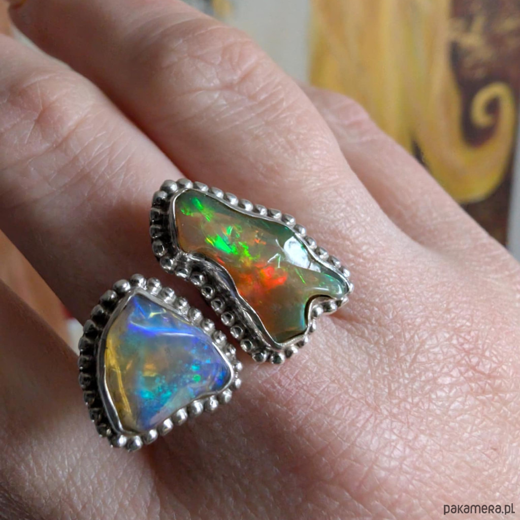 Pierścień zjawiskowy, wykonany ze srebra pr. 925 oraz płonących opali z Etiopii w surowej formie i oprawie 21 x 12 mm oraz 13 x 12 mm. Rozmiar jubilerski min 17, max 20. Ustawię odpowiedni, proszę o wiadomość w sprawie rozmiaru. Waga 8 g. Wykonany przez dostawcę kamieni. Pierścień zostanie zapakowany w ozdobne pudełeczko.
