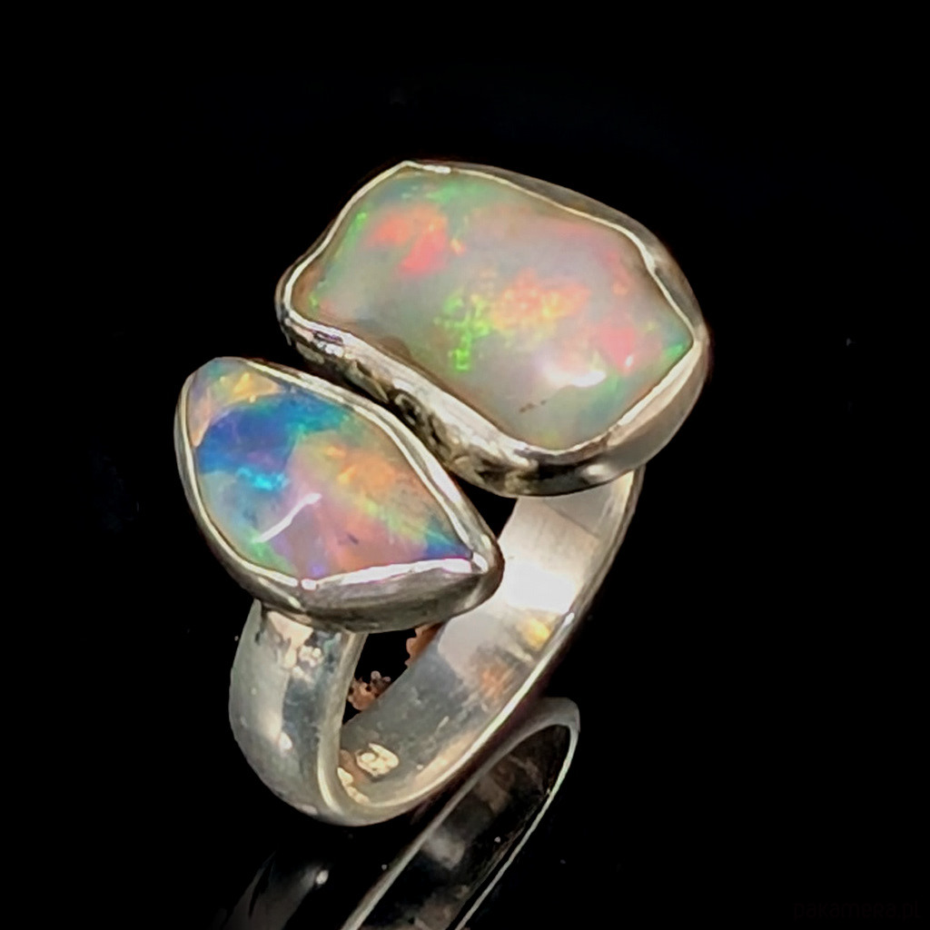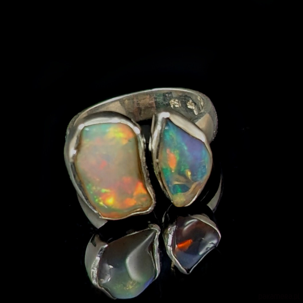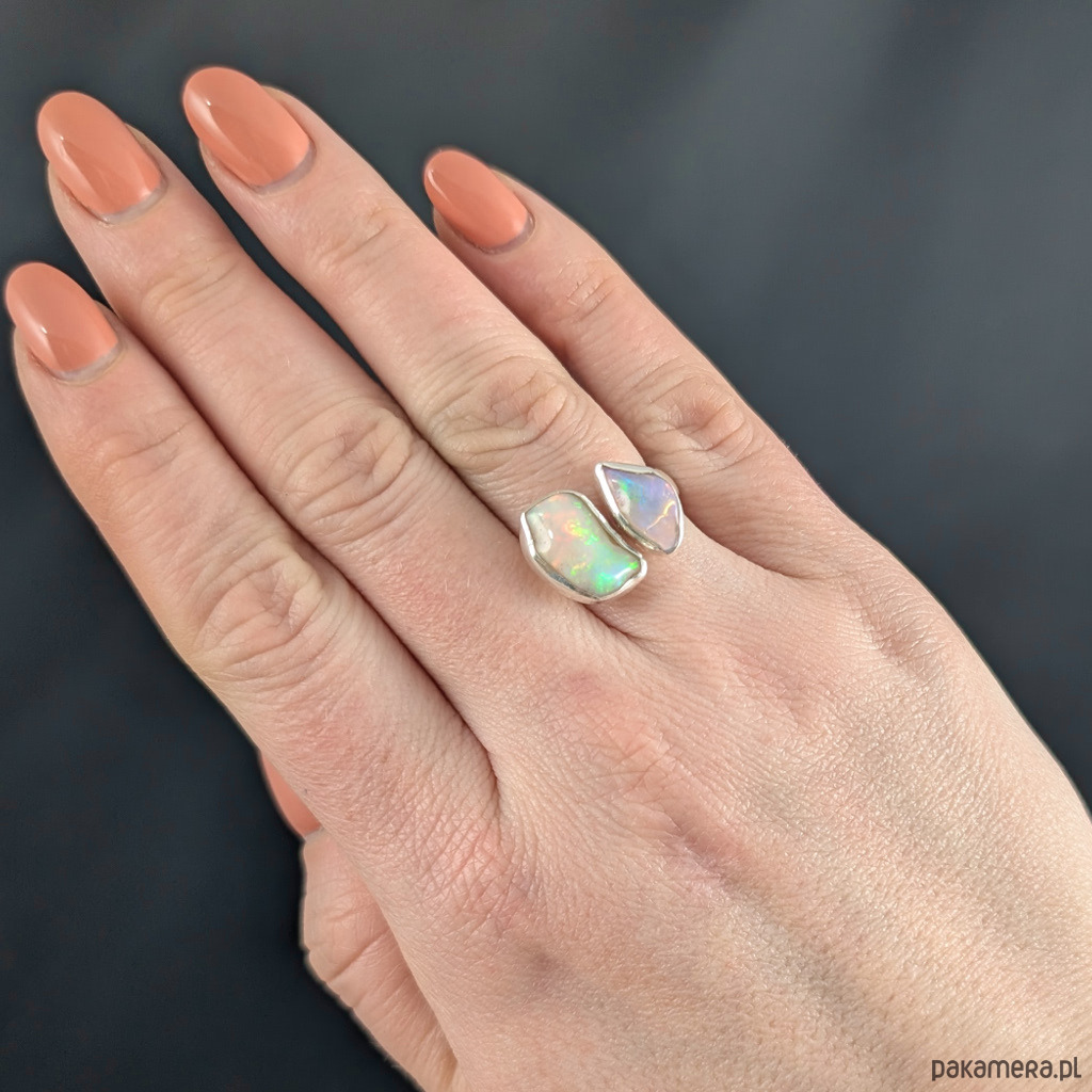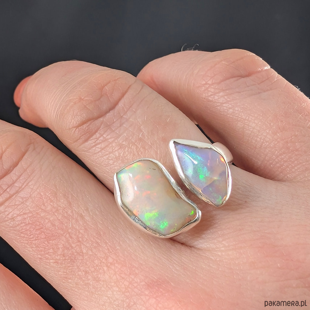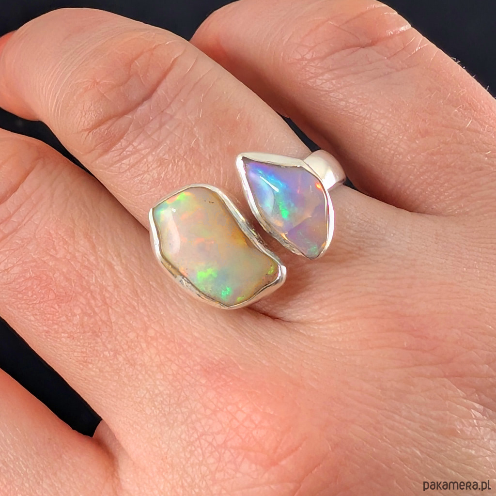 Pierścień zjawiskowy, wykonany ze srebra pr. 925 oraz opali z Etiopii w surowej formie i oprawie 14 x 9 mm oraz 12 x 7 mm. Rozmiar jubilerski min 14, max 17. Ustawię odpowiedni, proszę o wiadomość w sprawie rozmiaru. Waga 5,6 g. Wykonany przez dostawcę kamieni. Pierścień zostanie zapakowany w ozdobne pudełeczko.