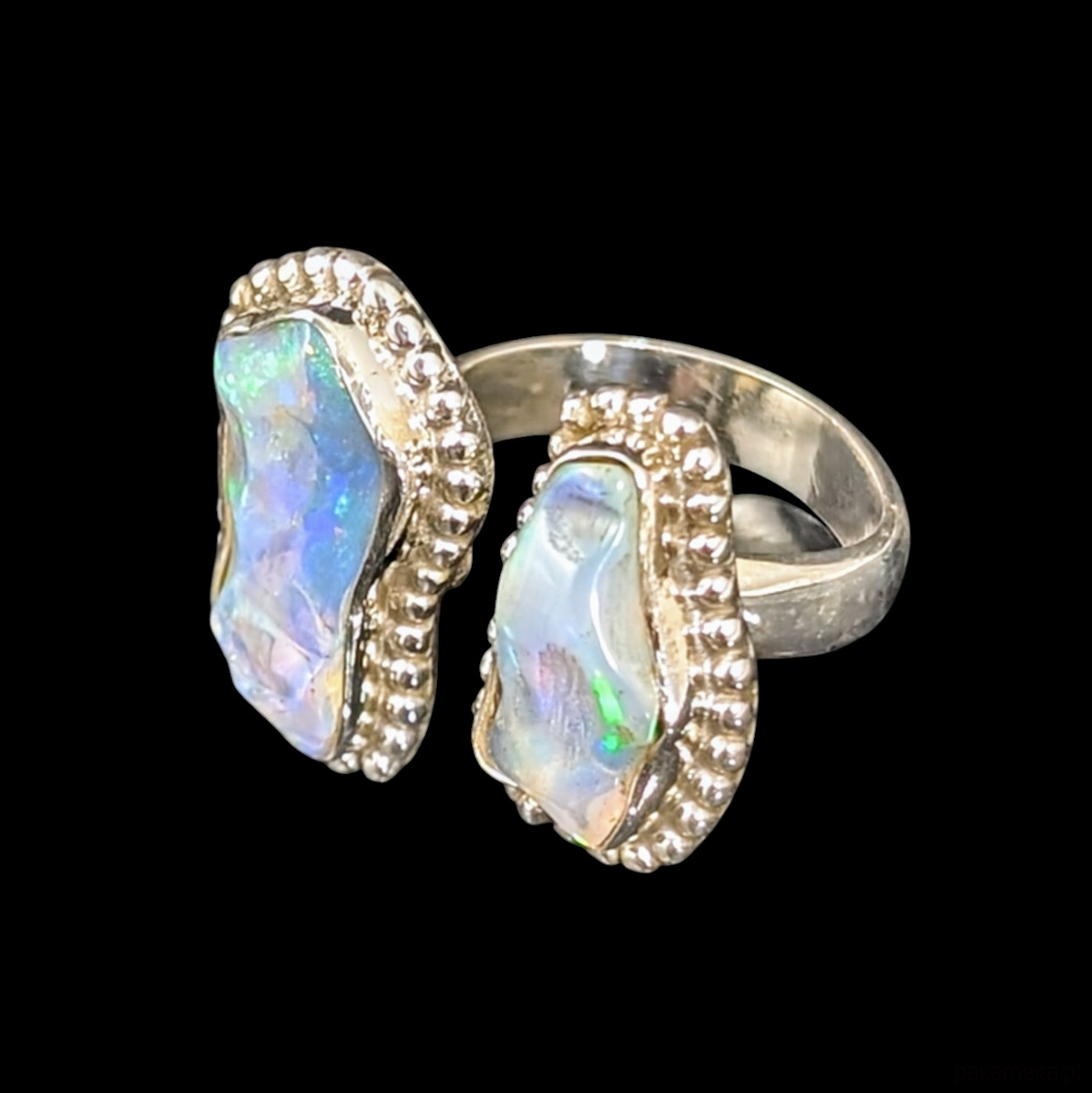 Pierścionek gemini- surowe opale z błękitną poświatą