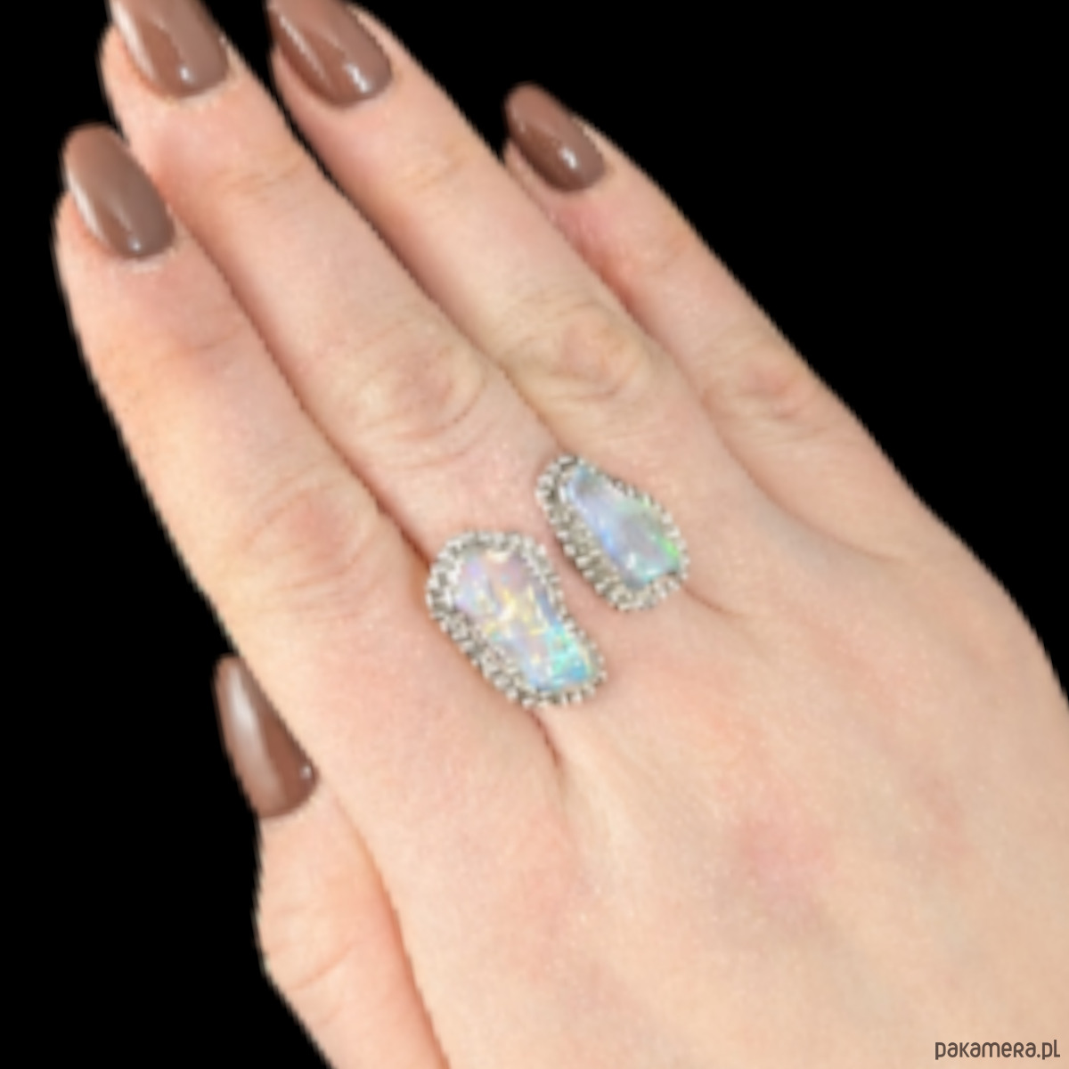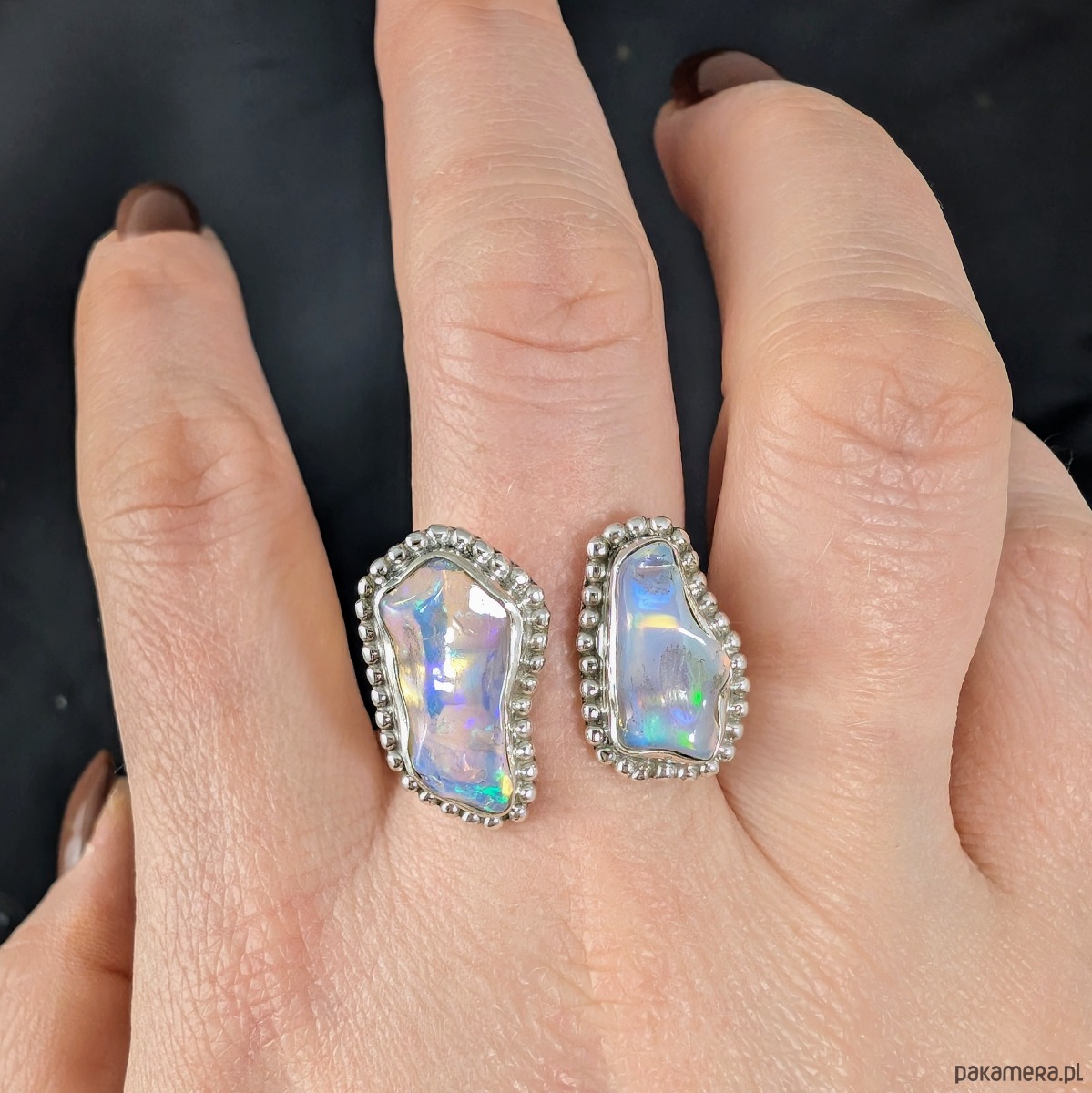 Pierścień wykonany ze srebra pr. 925 oraz płonących opali z Etiopii w surowej formie i oprawie 19 x 9 mm oraz 15 x 10 mm. Rozmiar jubilerski min 14 max 18. Ustawię odpowiedni, proszę o wiadomość w sprawie rozmiaru. Waga 8,5 g. Wykonany przez dostawcę kamieni. Pierścień zostanie zapakowany w ozdobne pudełeczko.