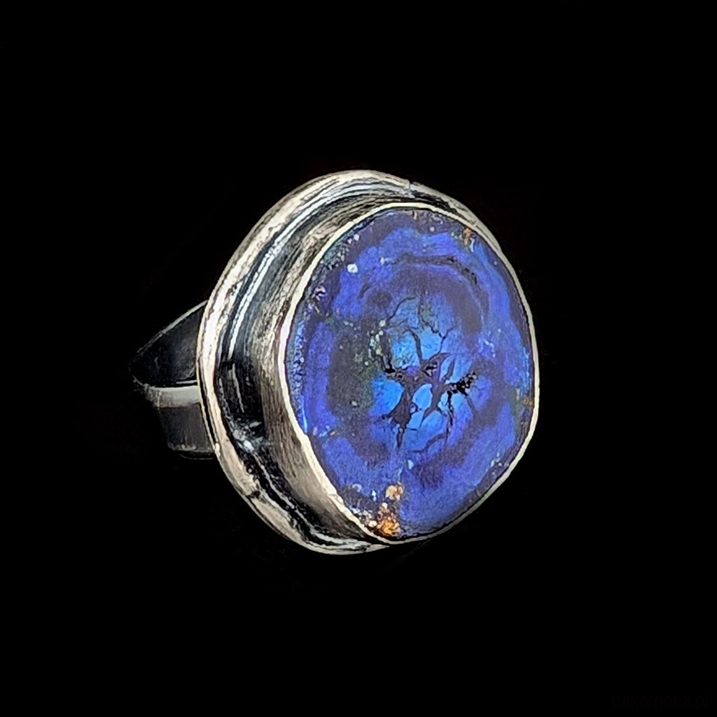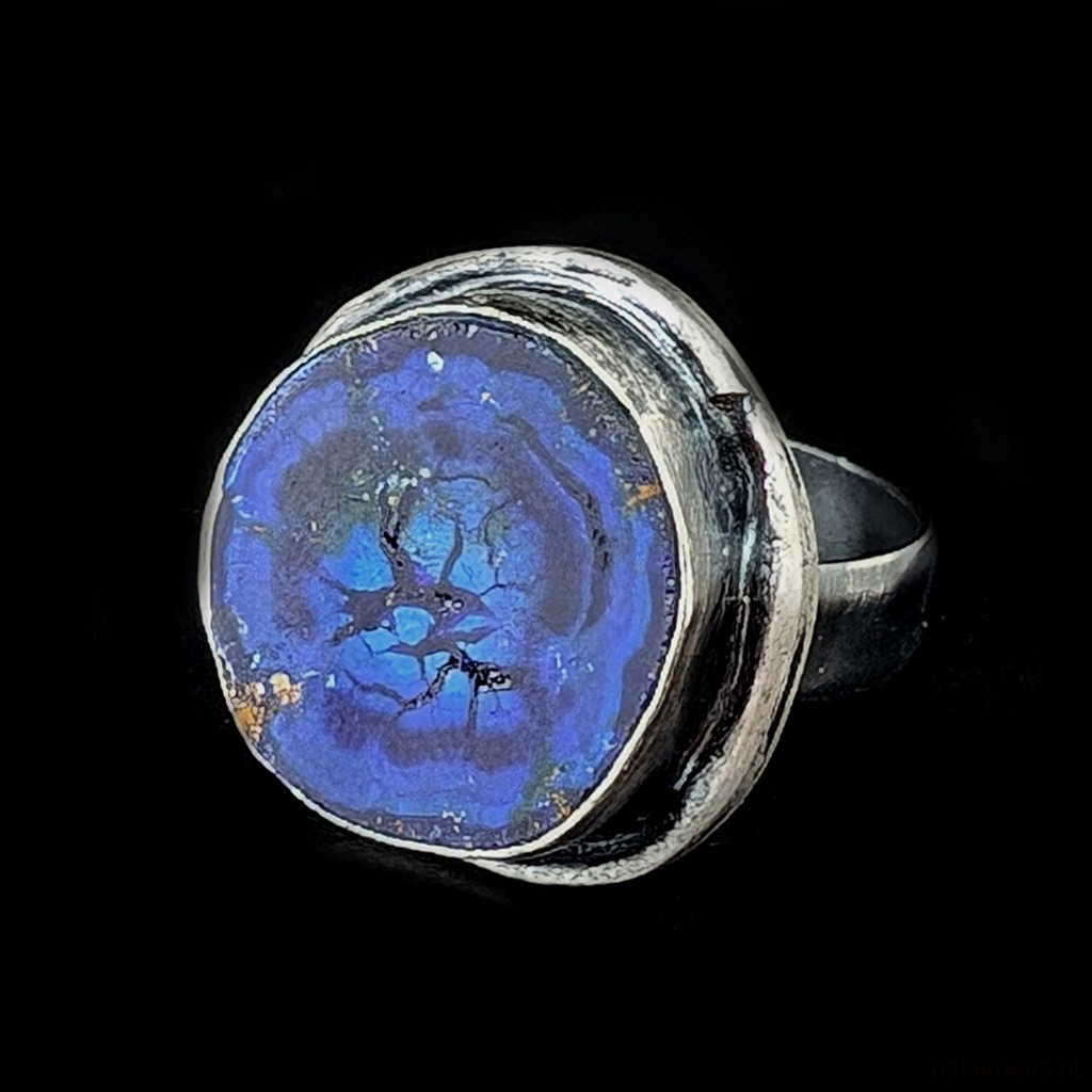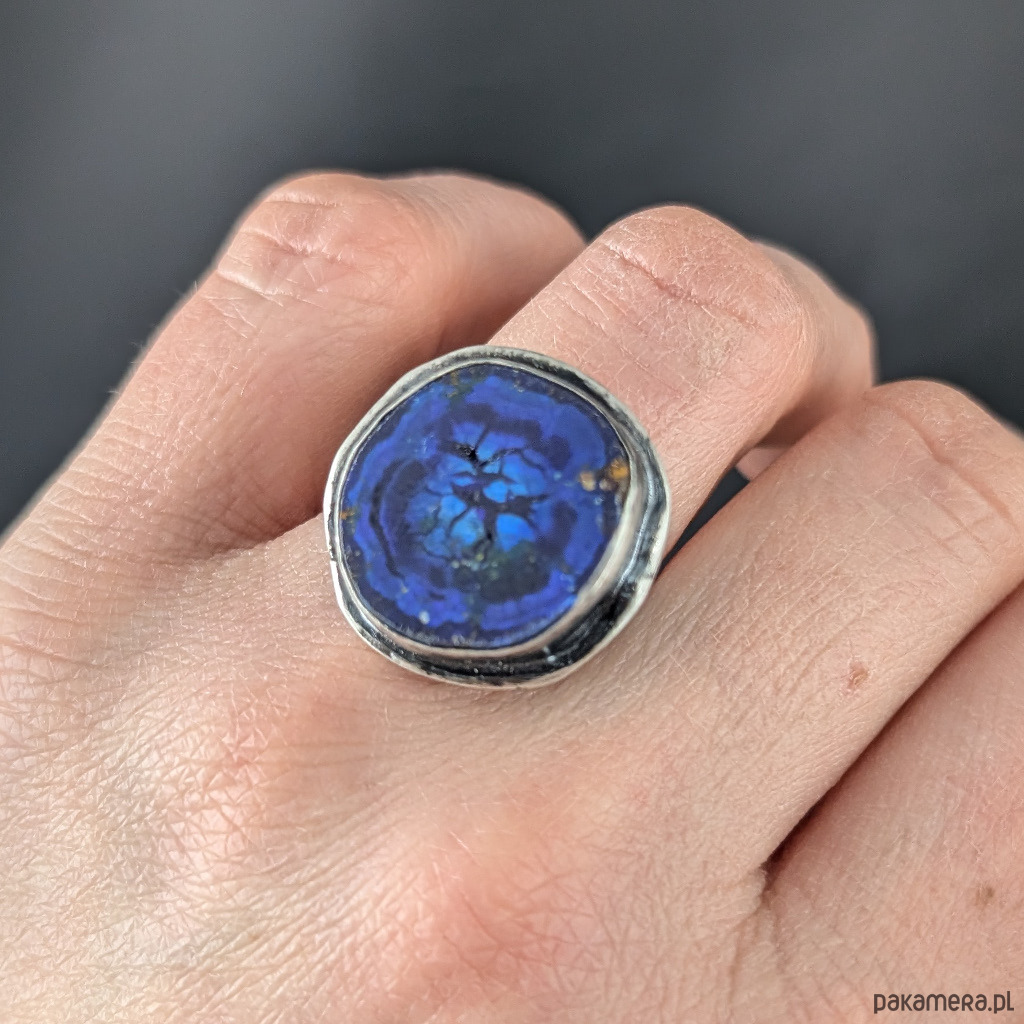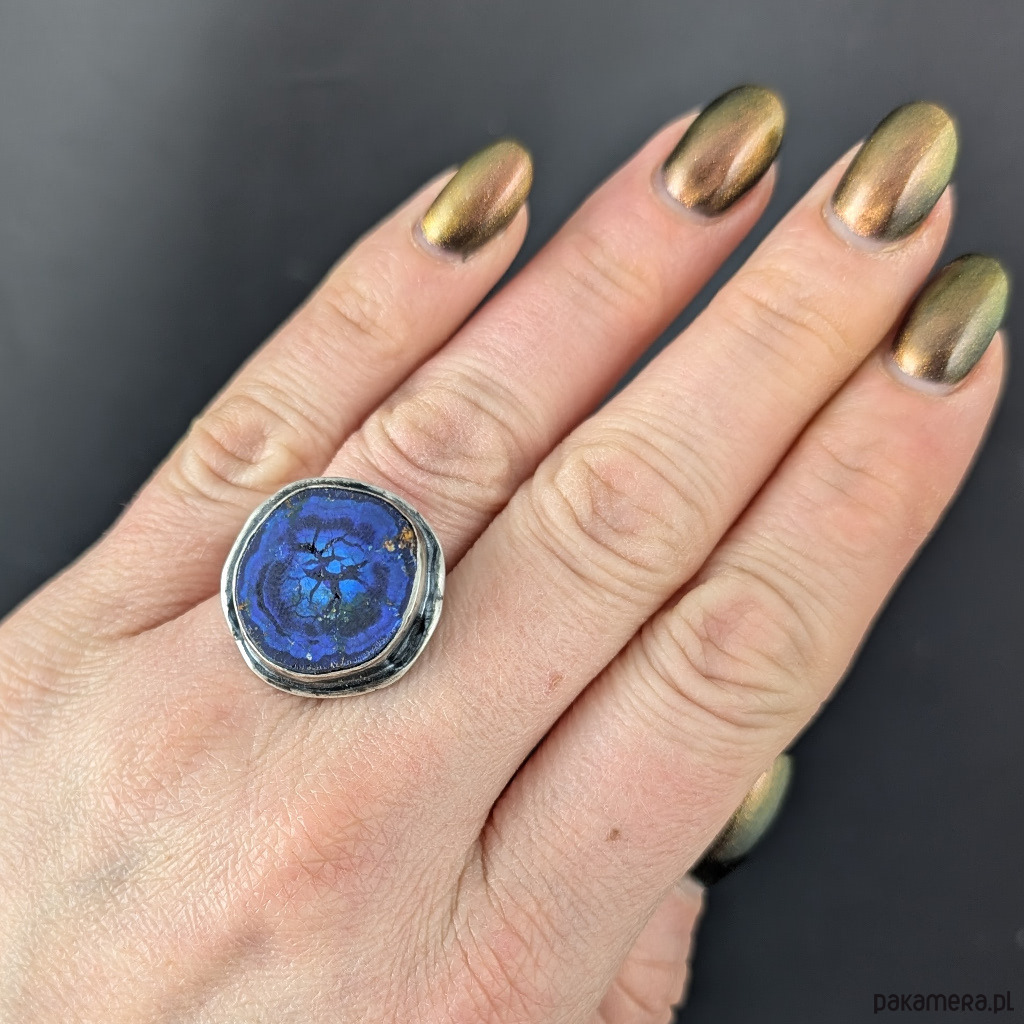 Jakościowy azuryt o chabrowym odcieniu. Geoda oprawiona w srebro próby 925, oksydowane, przecierane. Średnica pierścienia 23mm. Rozmiar jubilerski regulowany w szerokim zakresie, dopasuję po zakupie na odpowiedni Waga 12,5 g. Pierścionek zostanie zapakowany w ozdobne pudełeczko.